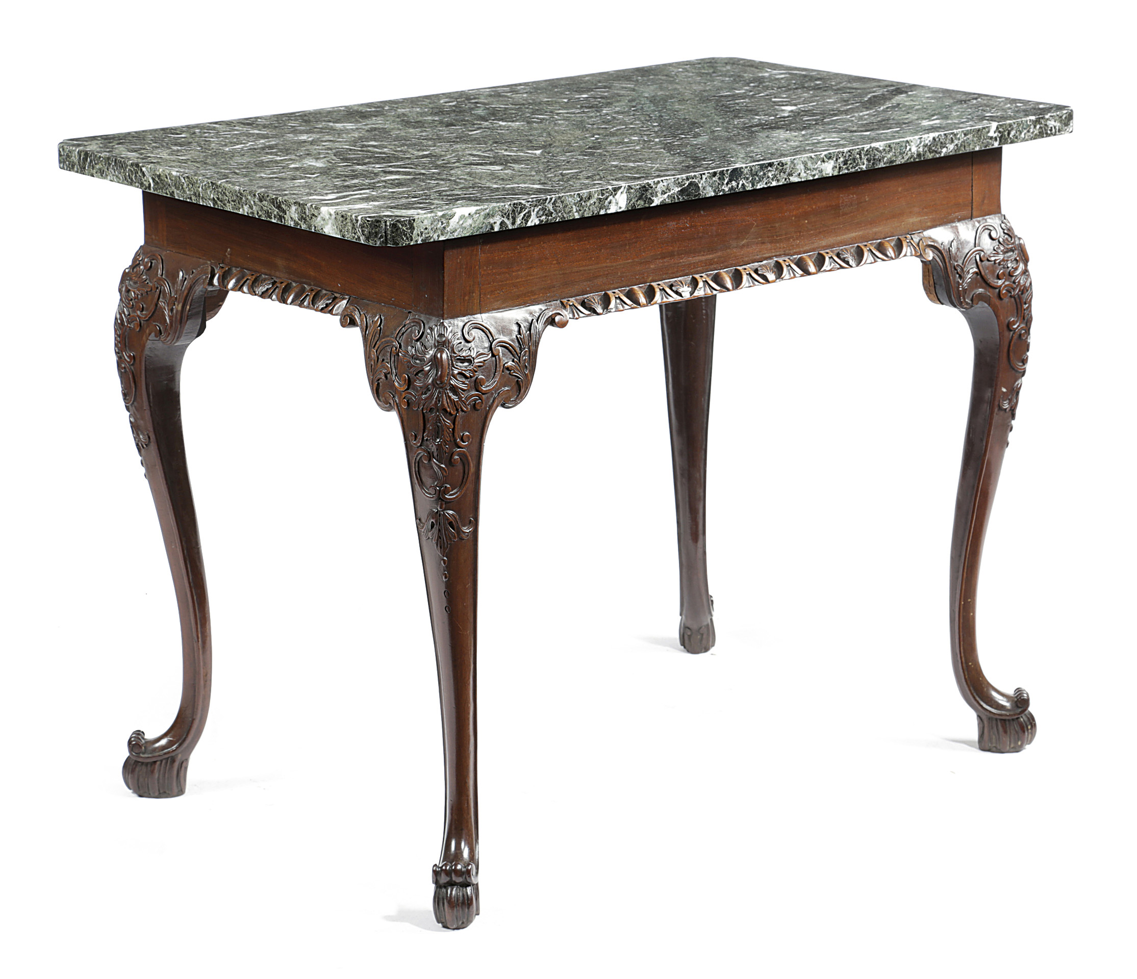 the later verde antico marble top above a plain frieze with ovolo and leaf mouldings, on scroll and cabochon carved cabriole legs, with scroll toes