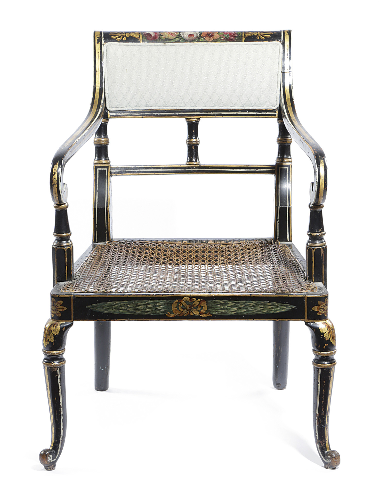 A REGENCY EBONISED AND PARCEL GILT ARMCHAIR