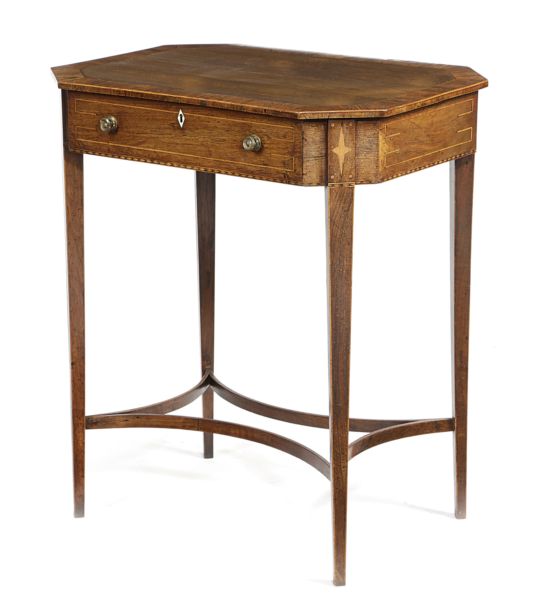 inlaid with stringing and lozenge parquetry banding, the crossbanded top above a frieze drawer, with a bone/ivory escutcheon