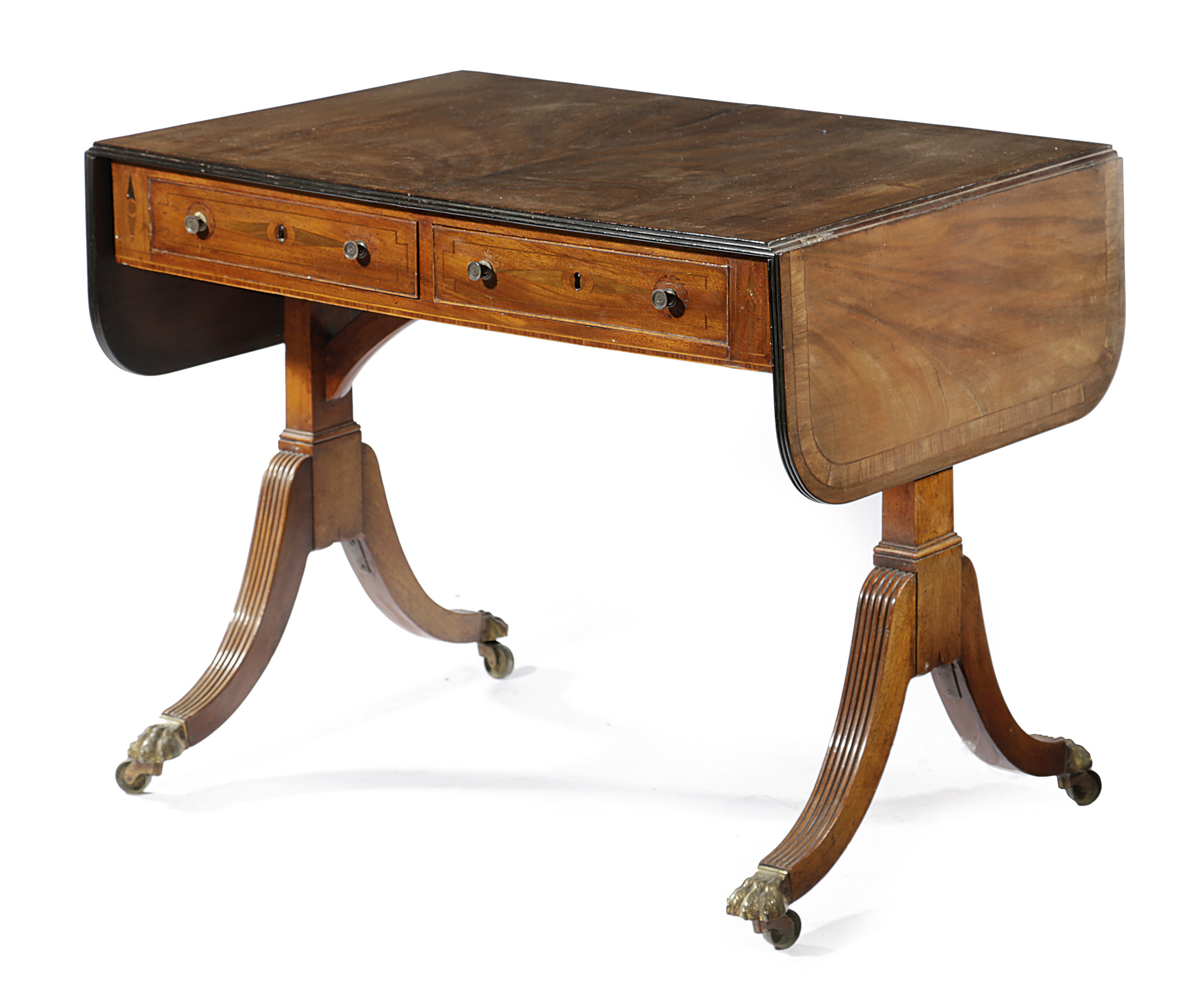 inlaid with stringing and with satinwood banding, fitted with two frieze drawers, on brass lion's paw sabot and castors