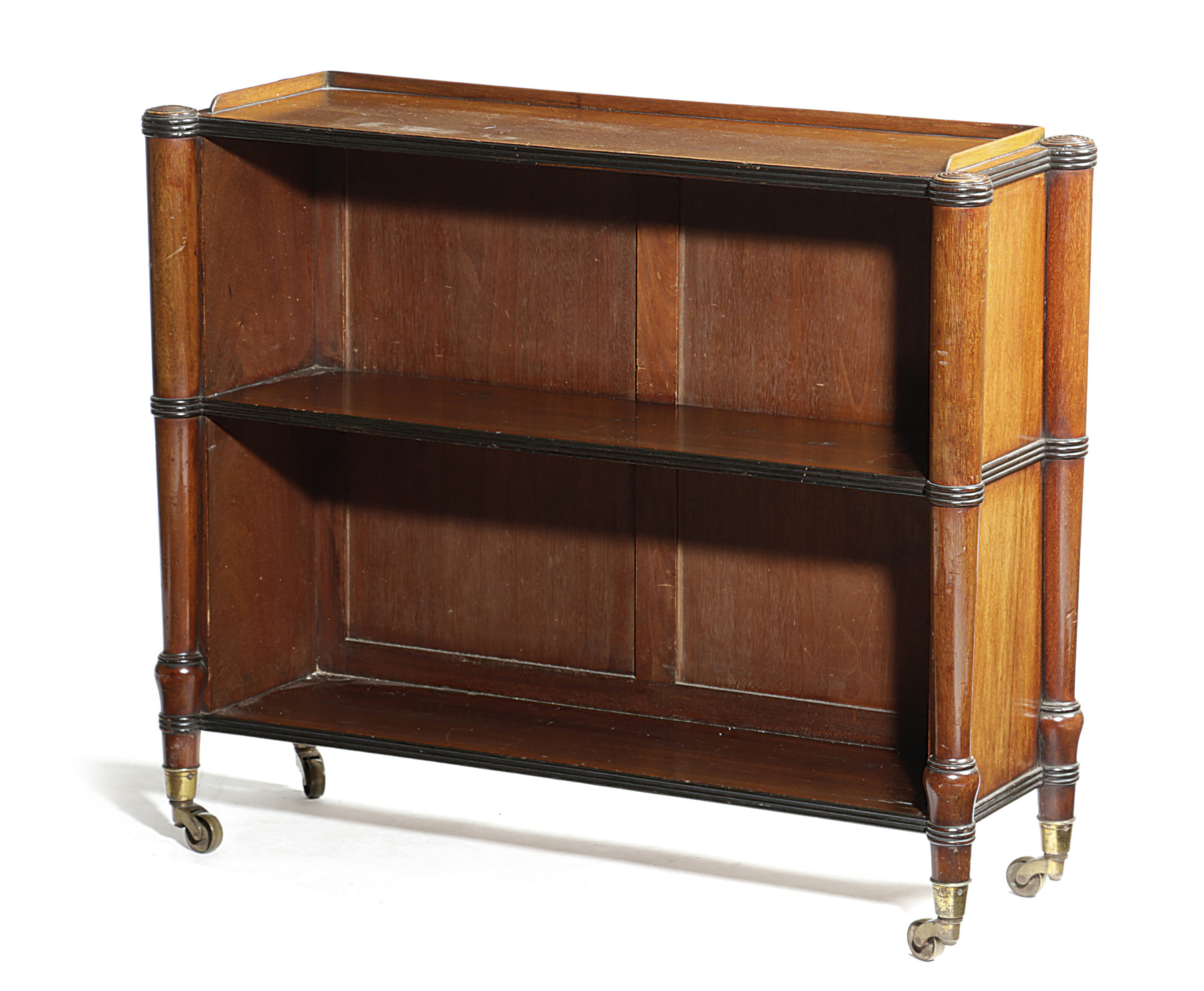the galleried top above two shelves, with reeded decoration and tapering columns, on brass castors