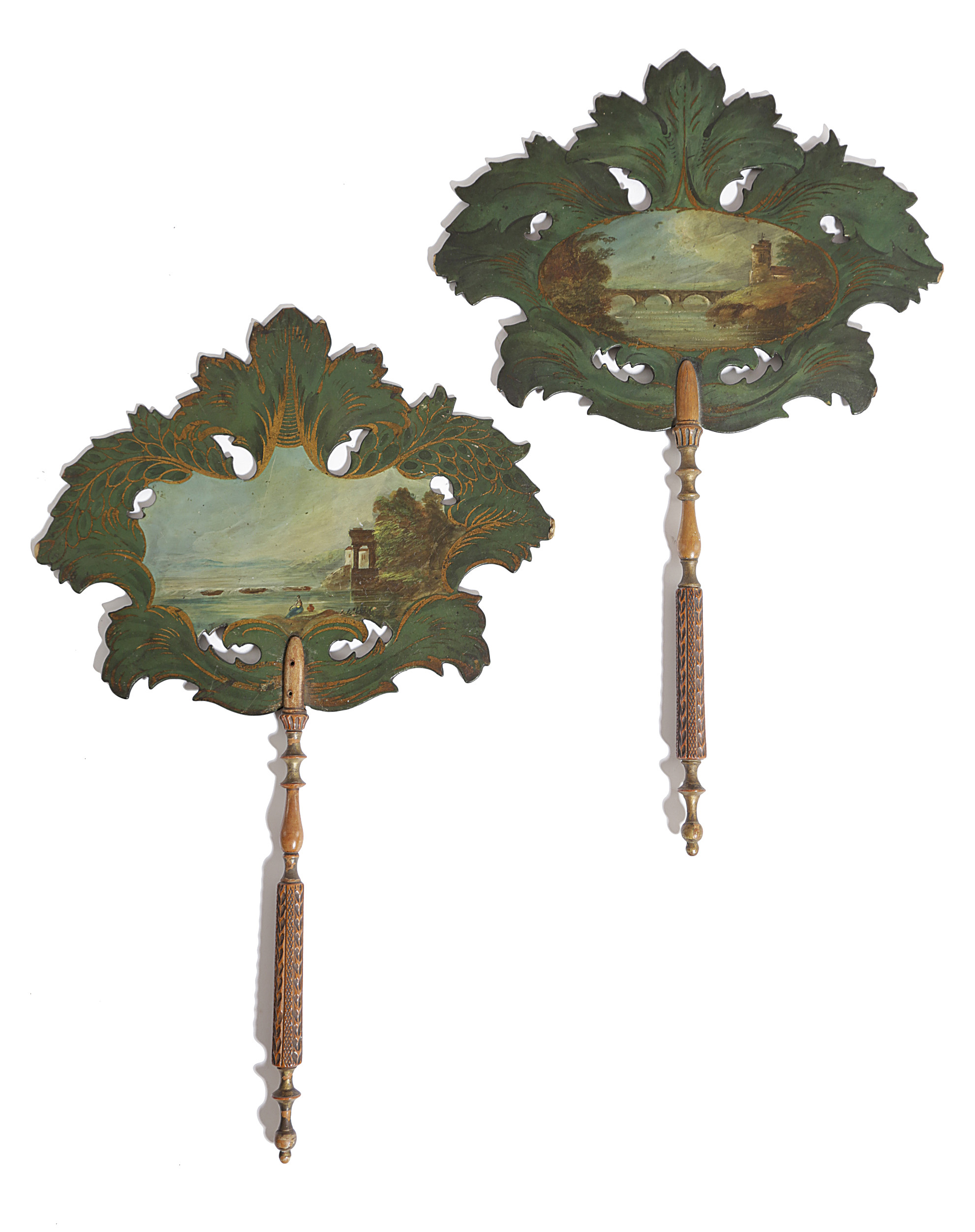 of cartouche form, painted with oval river and coastal scenes, in green and gilt foliate frames, on turned, carved and parcel gilt handles (2)