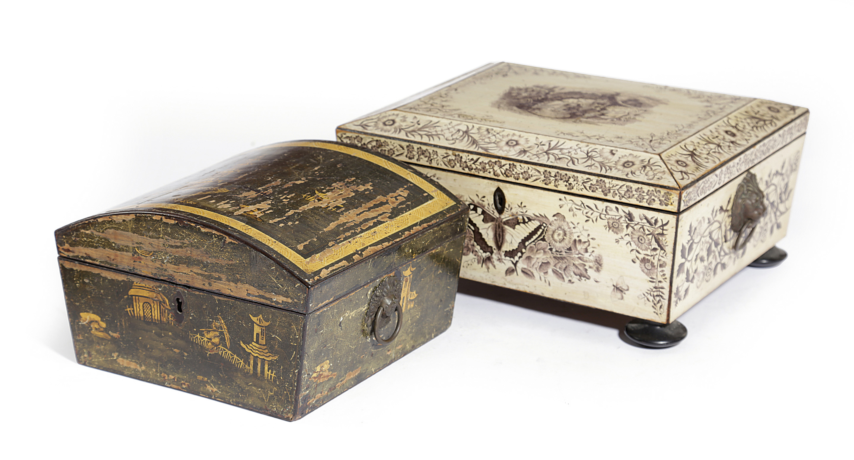 of sarcophagus form, painted in puce with a lady discovering a child in a rural setting and inside a floral border, the sides painted with insects and flowers; together with another box, of domed form, with gilt chinoiserie decoration (2)
