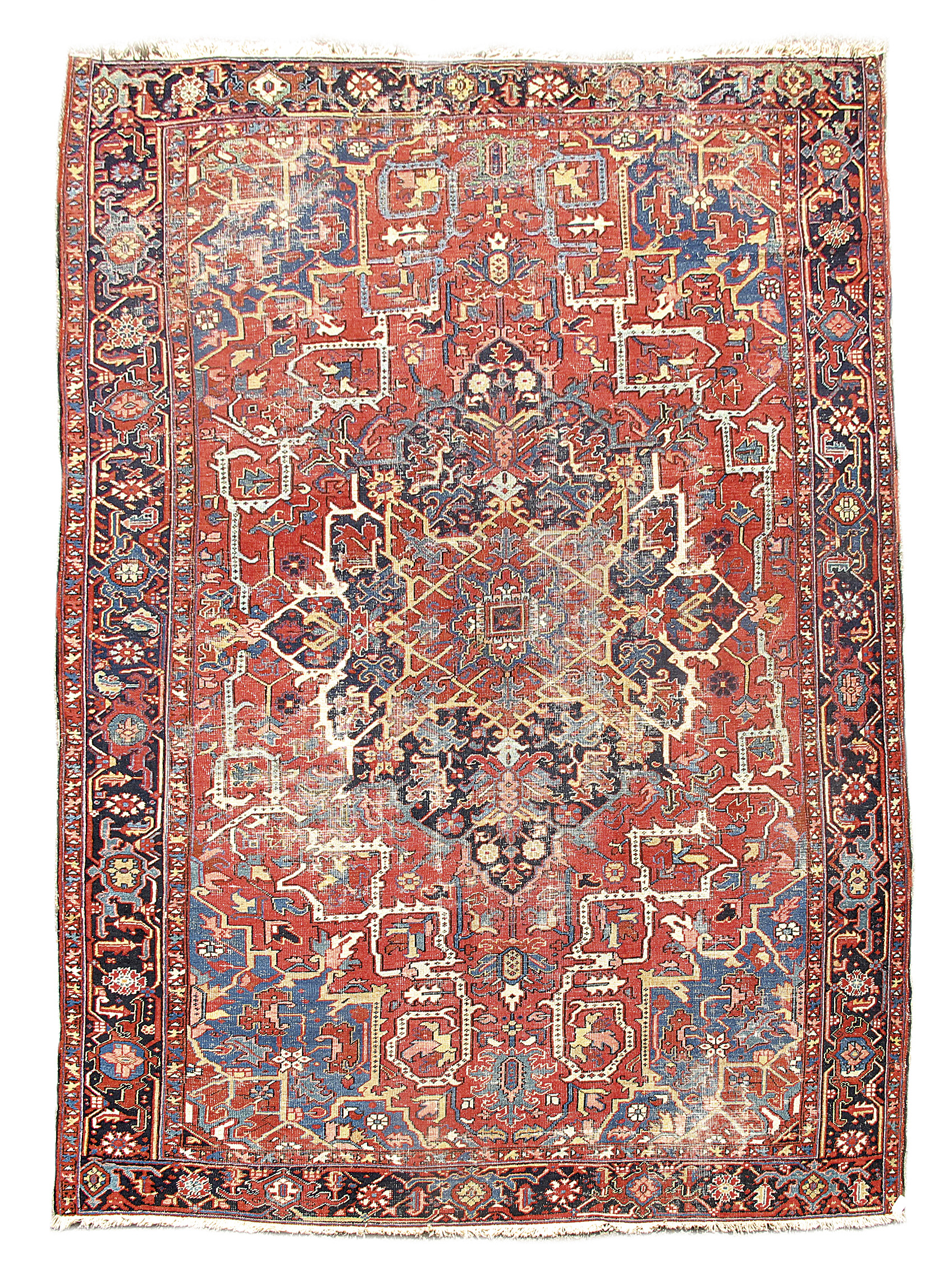 the madder field of angular vines around an indigo medallion, framed by sky-blue spandrels and deep indigo borders of samovar motifs and meandering angular vines flanked by guard stripes