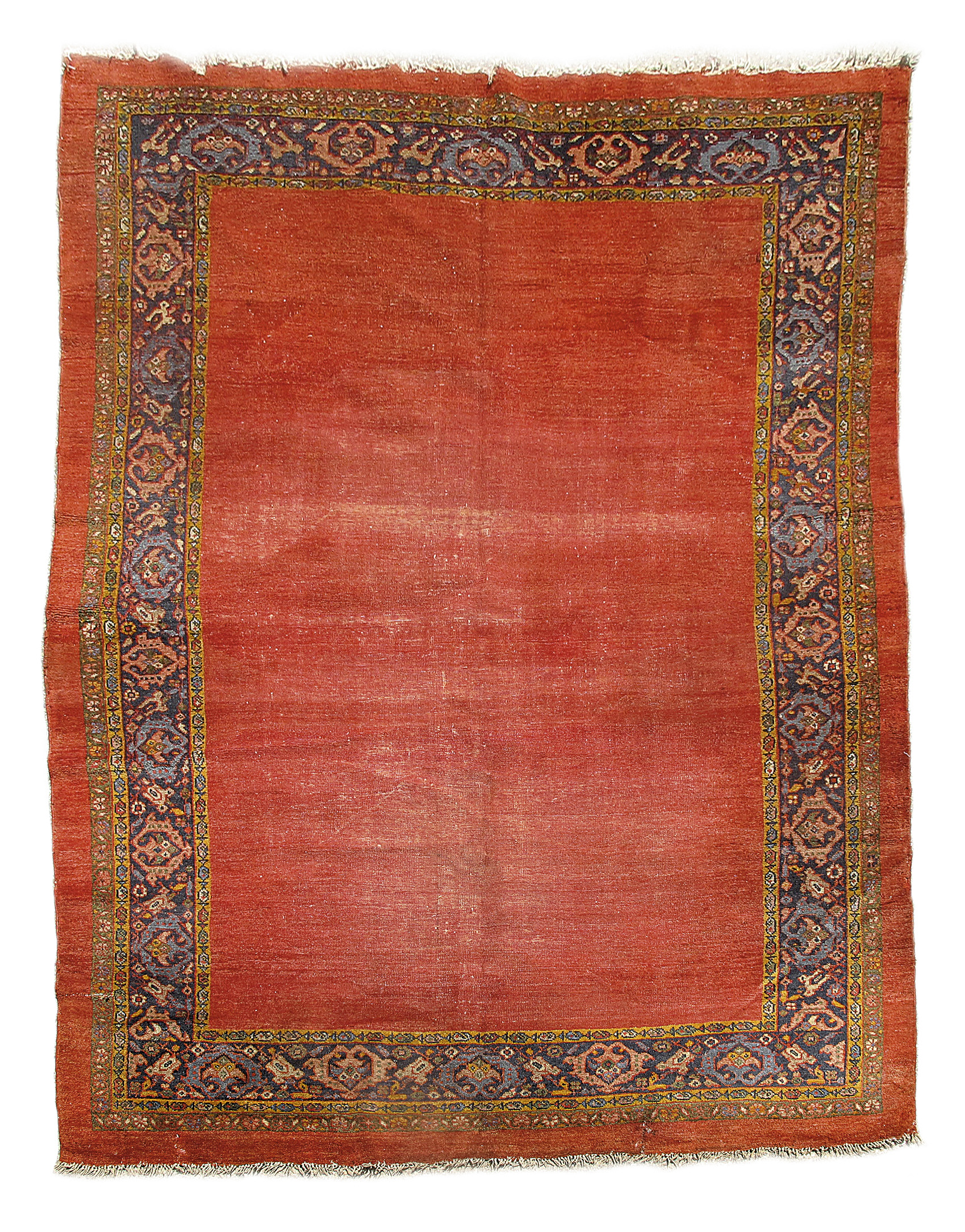the plain tomato red field enclosed by indigo borders of turtle motifs, flanked by carnation and boteh guard stripes