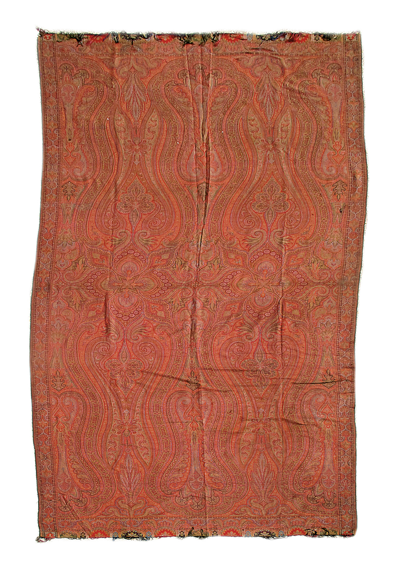 the soft brick red field of leafy scrolls and flowers enclosed by similar narrow borders