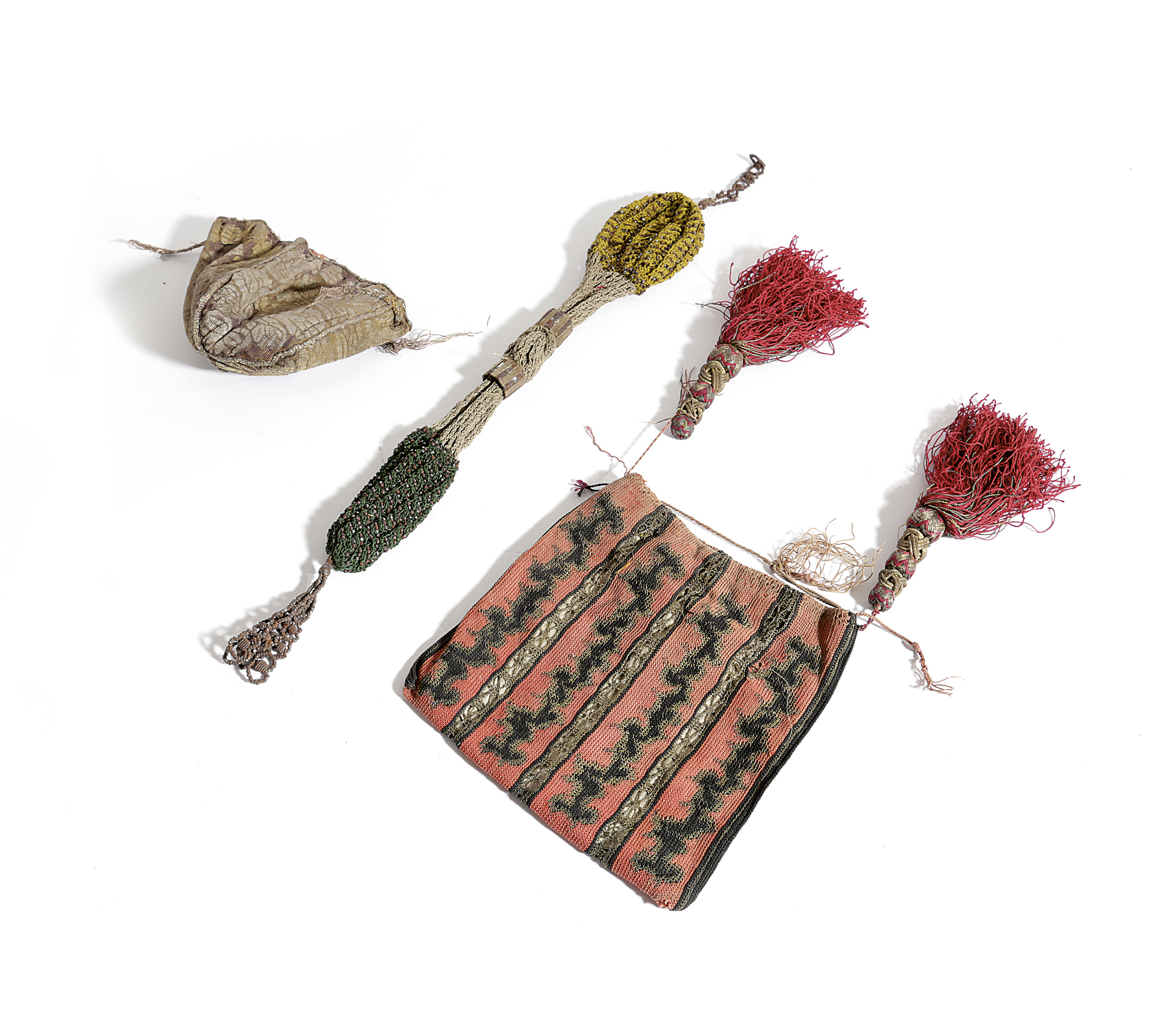 the four alternating panels woven with a coronet above an initial, surrounded by flowering foliage, with a pink silk lining; together with a purse with vertical bands in pink and black silk, and gilt thread intersperced with gilt thread lace work, with probably later tassels, and a miser's purse with cut-steel beads worked into the embroidery (3)