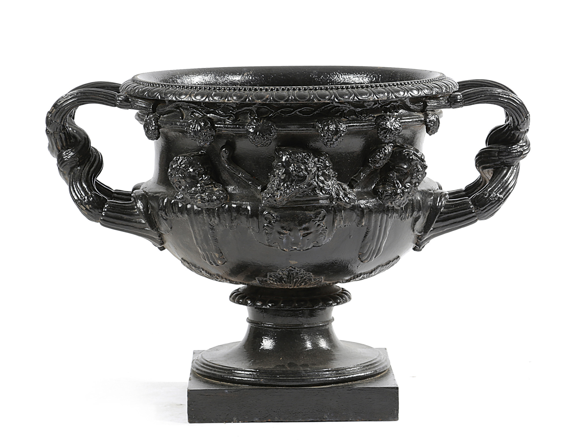 painted black, with entwined handles and decorated with busts
