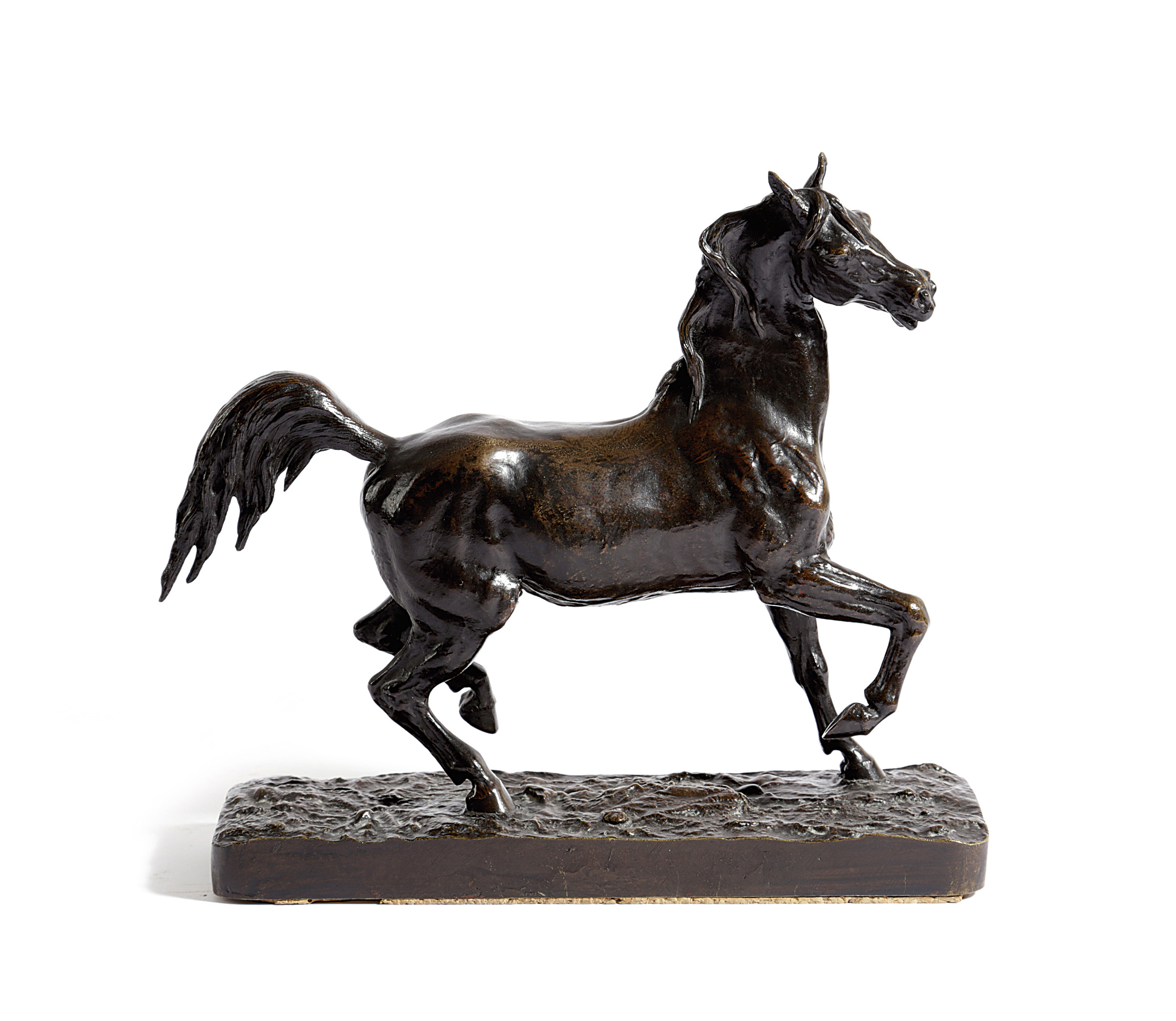 A FRENCH EQUESTRIAN BRONZE MODEL OF A PACING STALLION