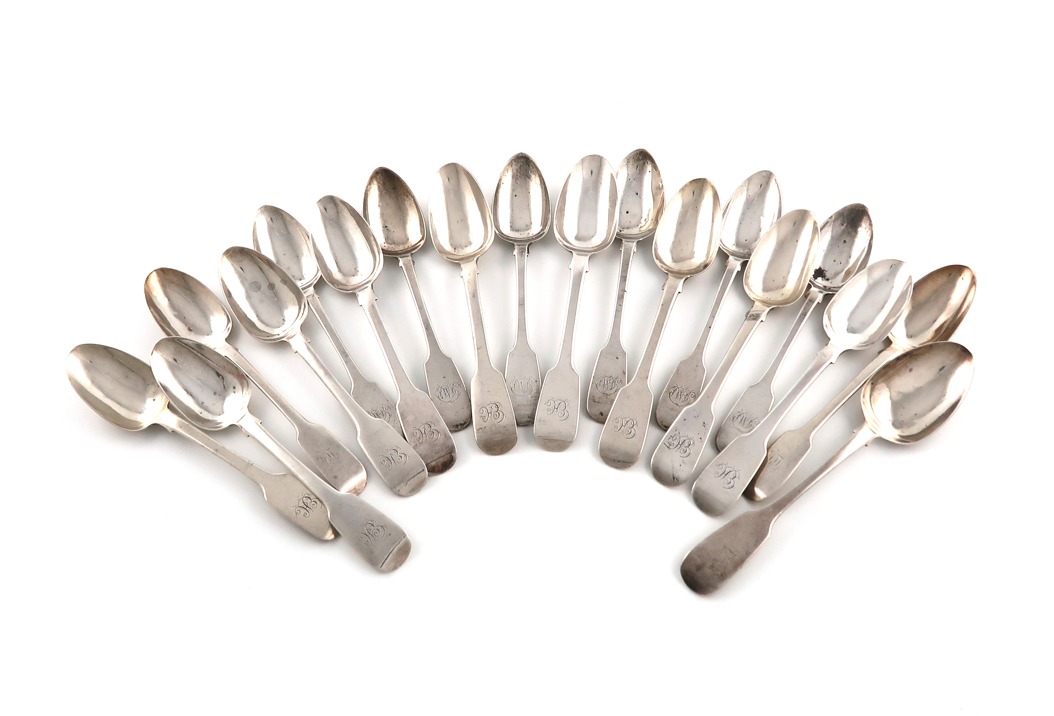 A matched set of eighteen Victorian Irish silver Fiddle pattern teaspoons