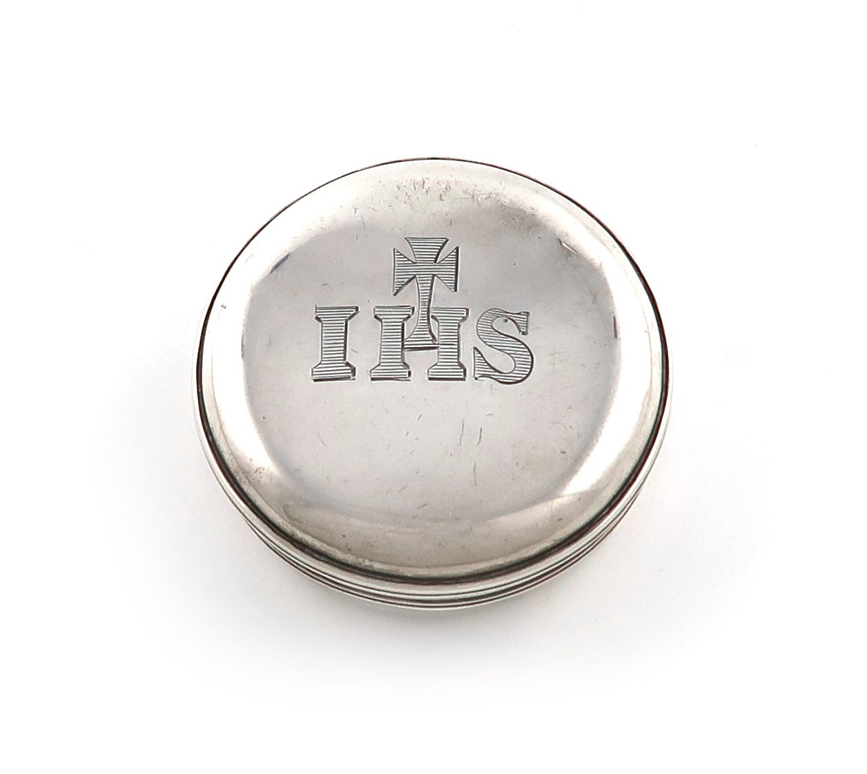 circular form, the pull-off cover engraved 'IHS' below a cross, pull-off cover, gilded interior, diameter 6.8cm, approx. weight 2.3oz.