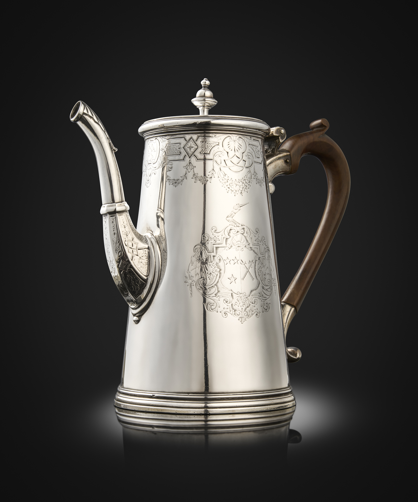 tapering circular form, chased foliate shell and strap-work border, leaf capped faceted tapering spout with chased decoration, flat chased cover with an urn finial, wooden scroll handle, on a circular foot, engraved with an armorial within foliate scroll mantling, the reverse with a crest, the underside with a scratch weight '33:17', height 22cm, approx. weight 34oz.
