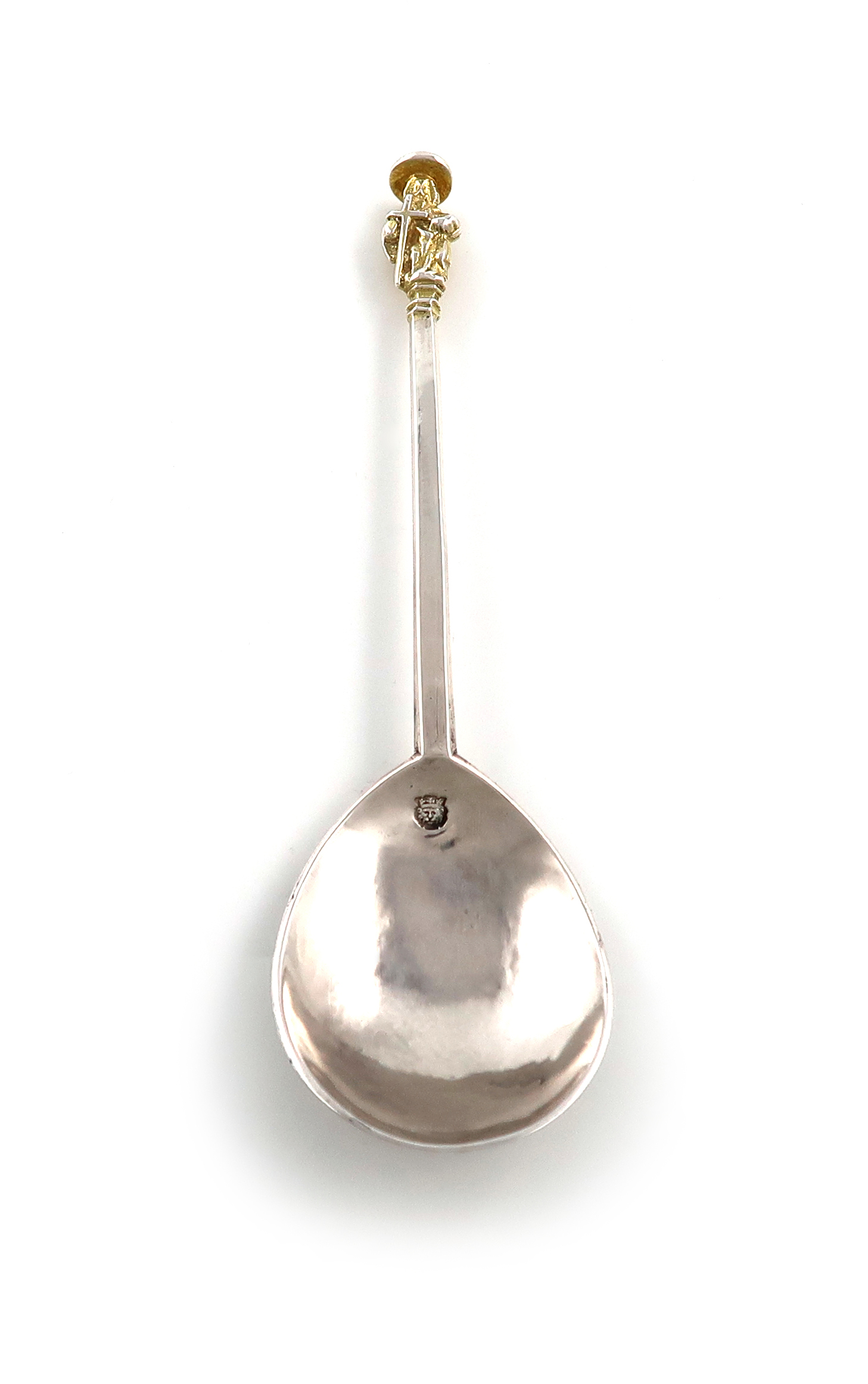 fig-shaped bowl, faceted tapering stem with a gilded finial, with a holy dove nimbus, the reverse of the bowl with prick-dot initials 'G.S' over 'T.W', length 18.5cm, approx. weight 1.6oz.