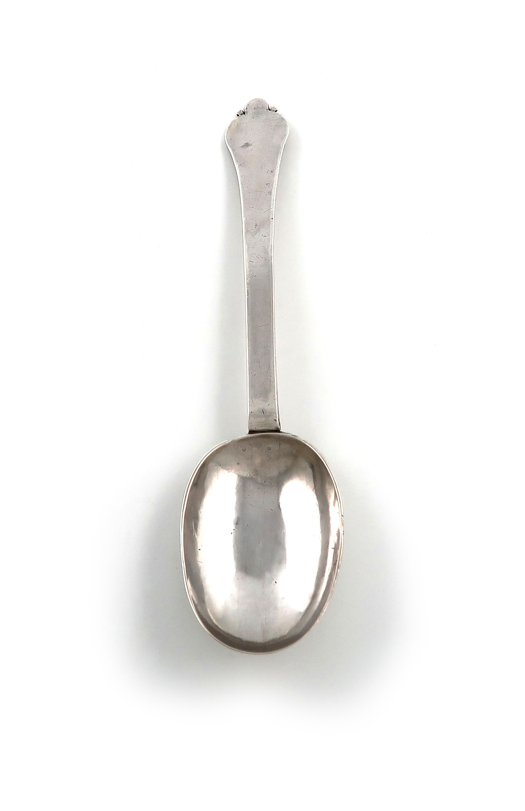 the reverse of the oval bowl with a raised rat-tail and flame decoration, the reverse of the terminal with later scratch initials 'A*C over 'W*P' over '1716', length 20.3cm, approx. weight 2oz.