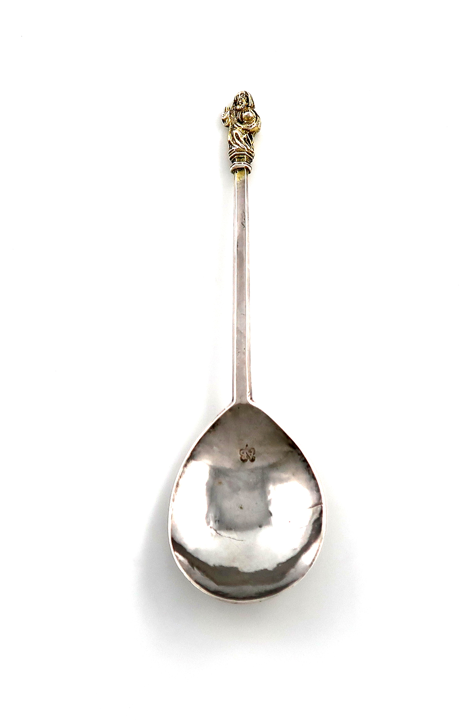 fig-shaped bowl, faceted tapering stem, the gilded finial with no nimbus, the reverse of the bowl with prick-dot initials 'K.W' over '1672', length 18.7cm, approx. weight 1.6oz.