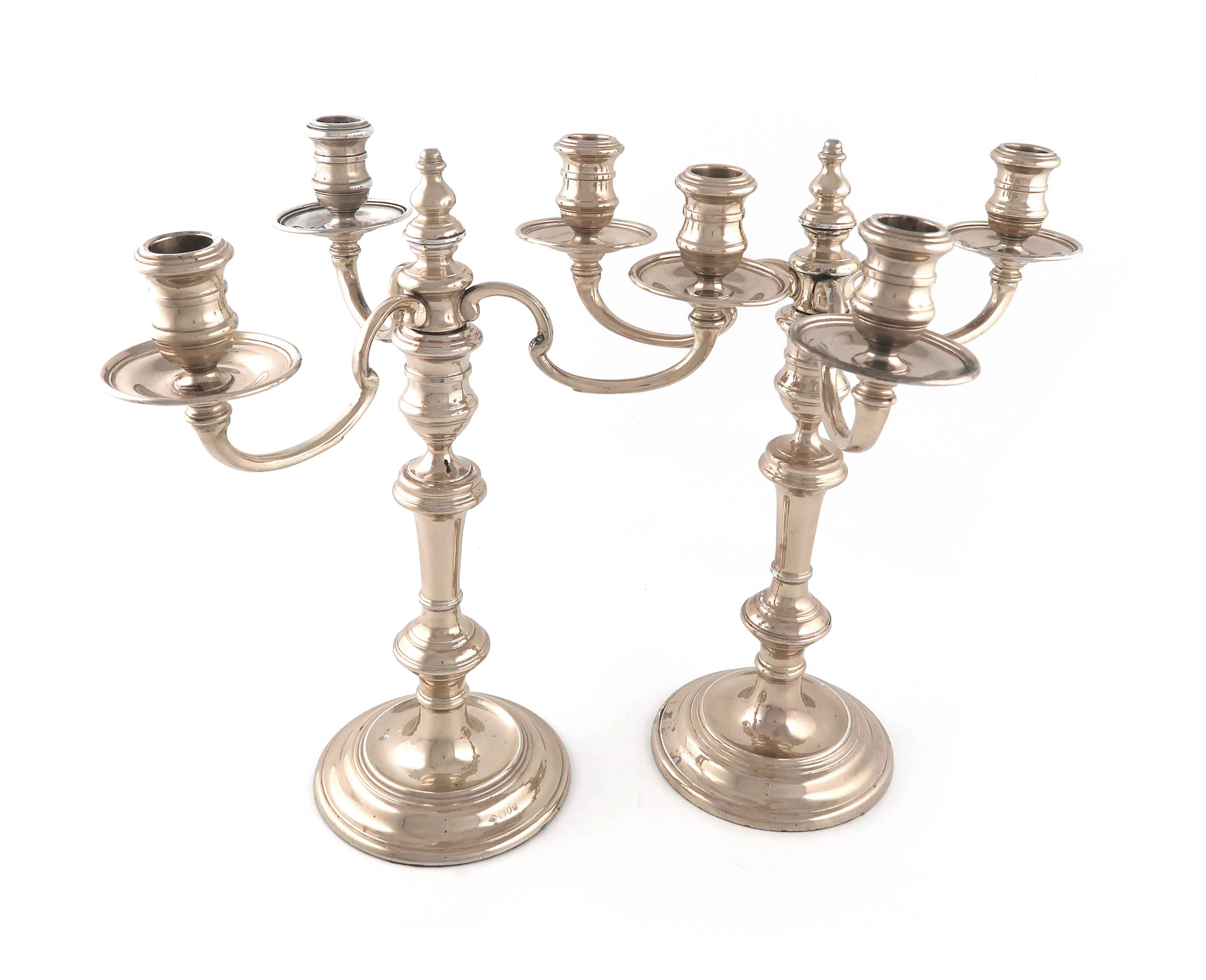 A pair of modern silver three-light candelabra