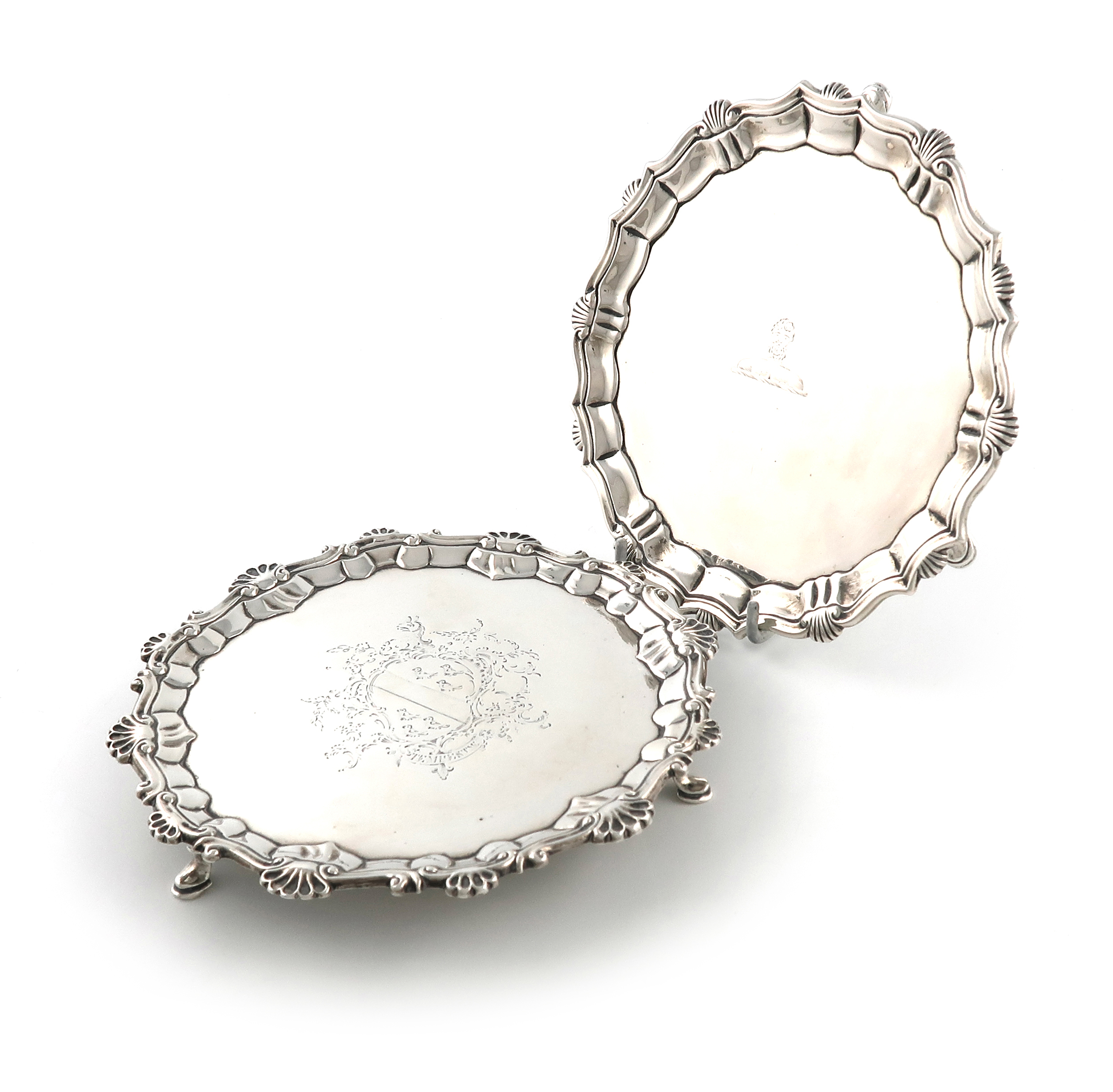 circular form, shell and scroll border, engraved with a crest, on four scroll feet, diameter 16.5cm, plus a George III waiter, by Crouch and Hannam, London 1773, shell and scroll border, engraved with an armorial within foliate mantling, diameter 16.7cm, approx. weight 15.5oz. (2)