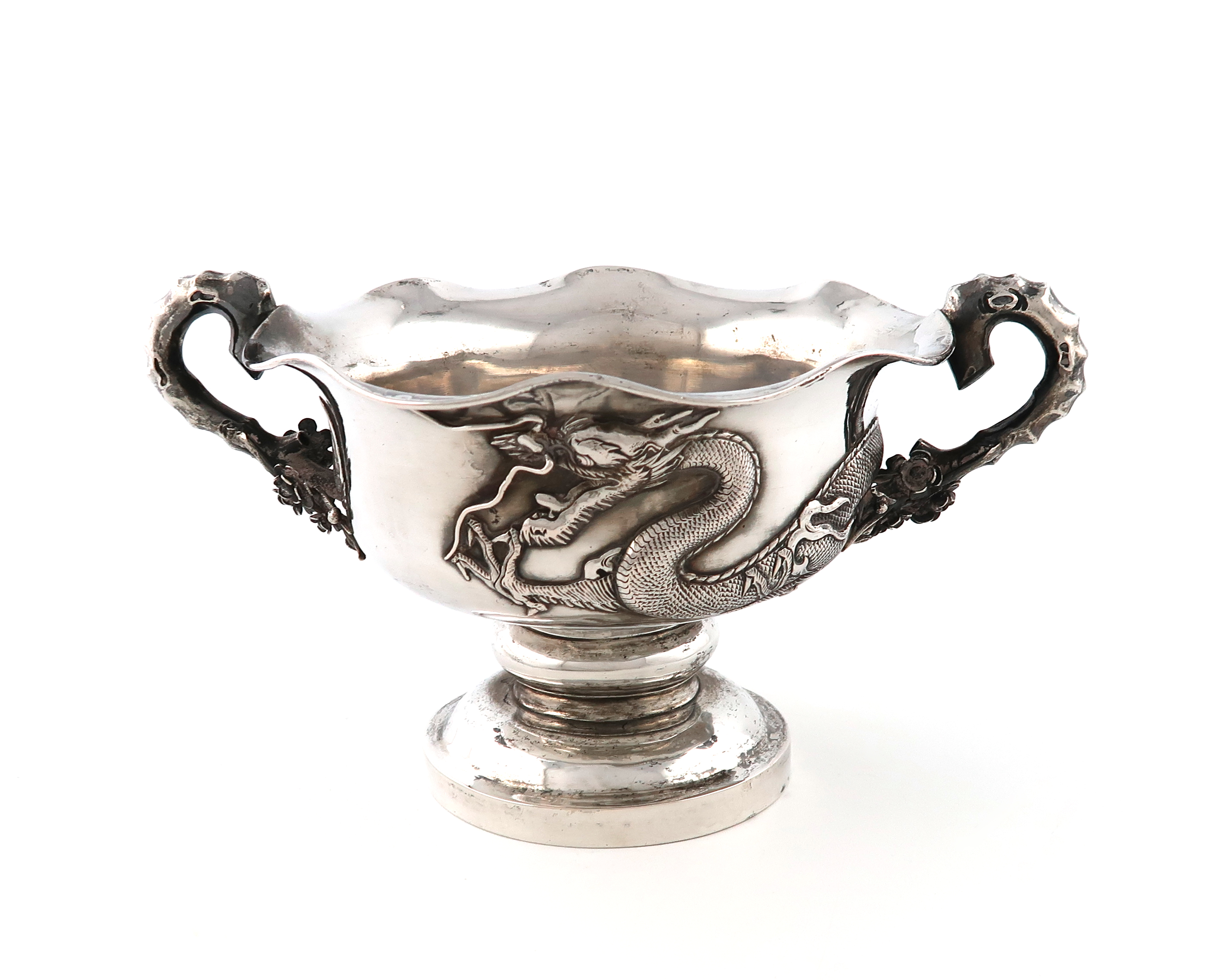 circular form, wavy-edge border, the body applied with a dragon, cherry blossom scroll handles, on a raised circular foot, length handle to handle 24cm, approx. weight 18.6oz.