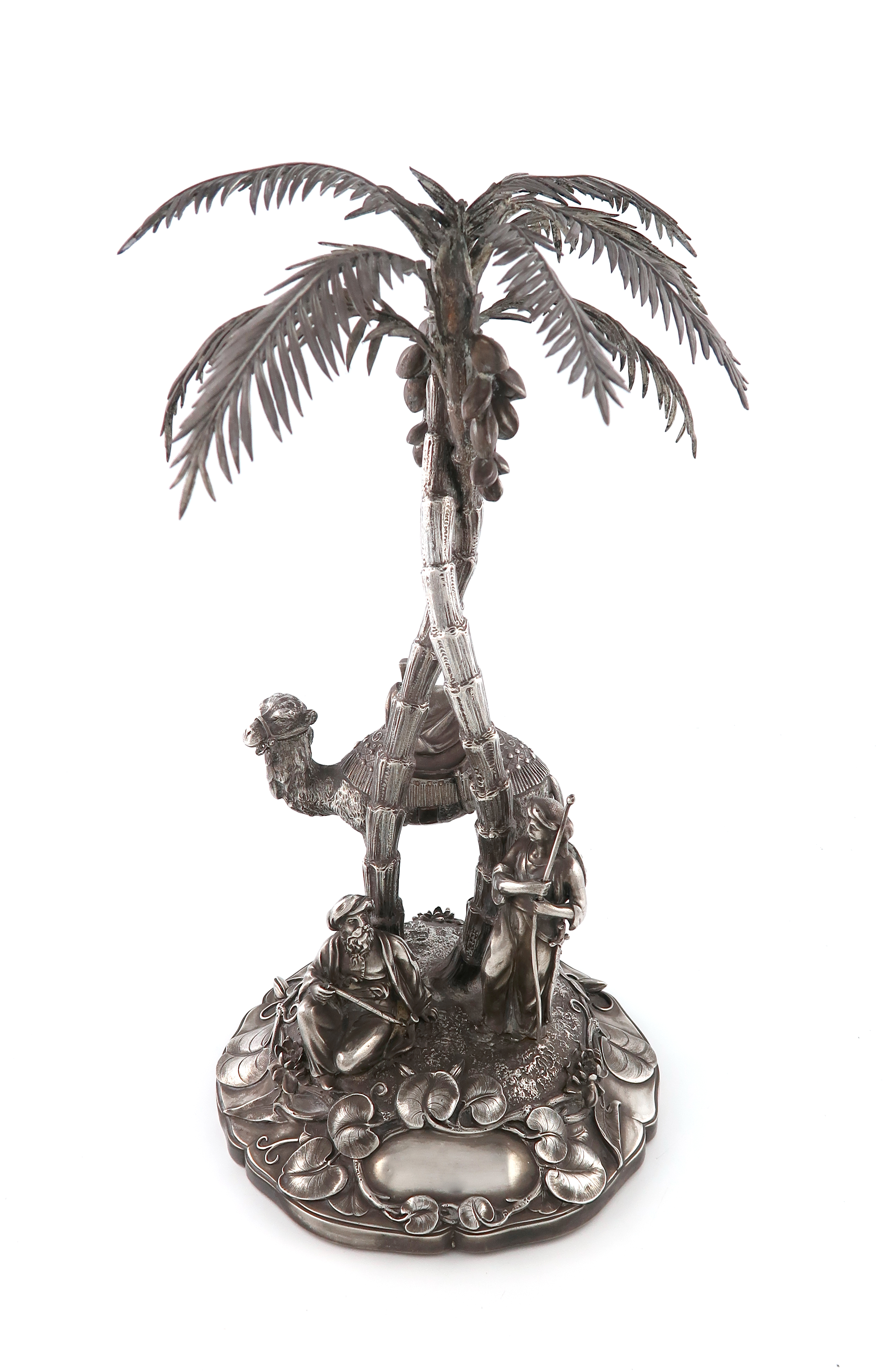 the central column modelled as two entwined palm trees, some leaves missing, on a raised circular base mounted with a camel and a two figures, one seated holding a pipe, the other standing holding a staff, the base with foliate decoration, height 43cm, approx. weight 79.9oz.