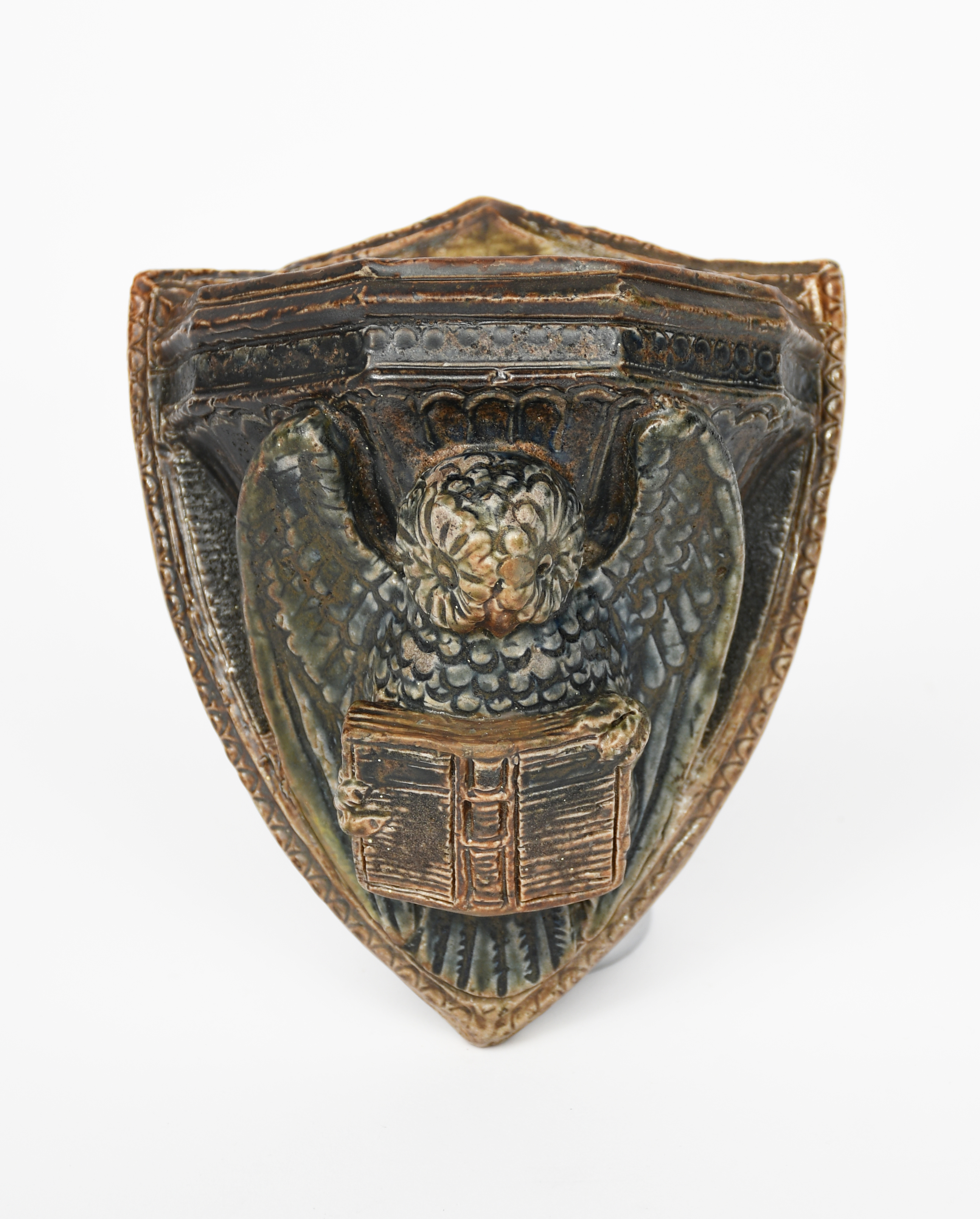 A Martin Brothers stoneware Owl vesta by Robert Wallace Martin, dated 1877, shield shaped with an Owl below corbel, clutching a book in its talons, glazed brown, blue and green, incised 2-1877, 29, R W Martin, professional restoration to front rim, 13.5cm. high