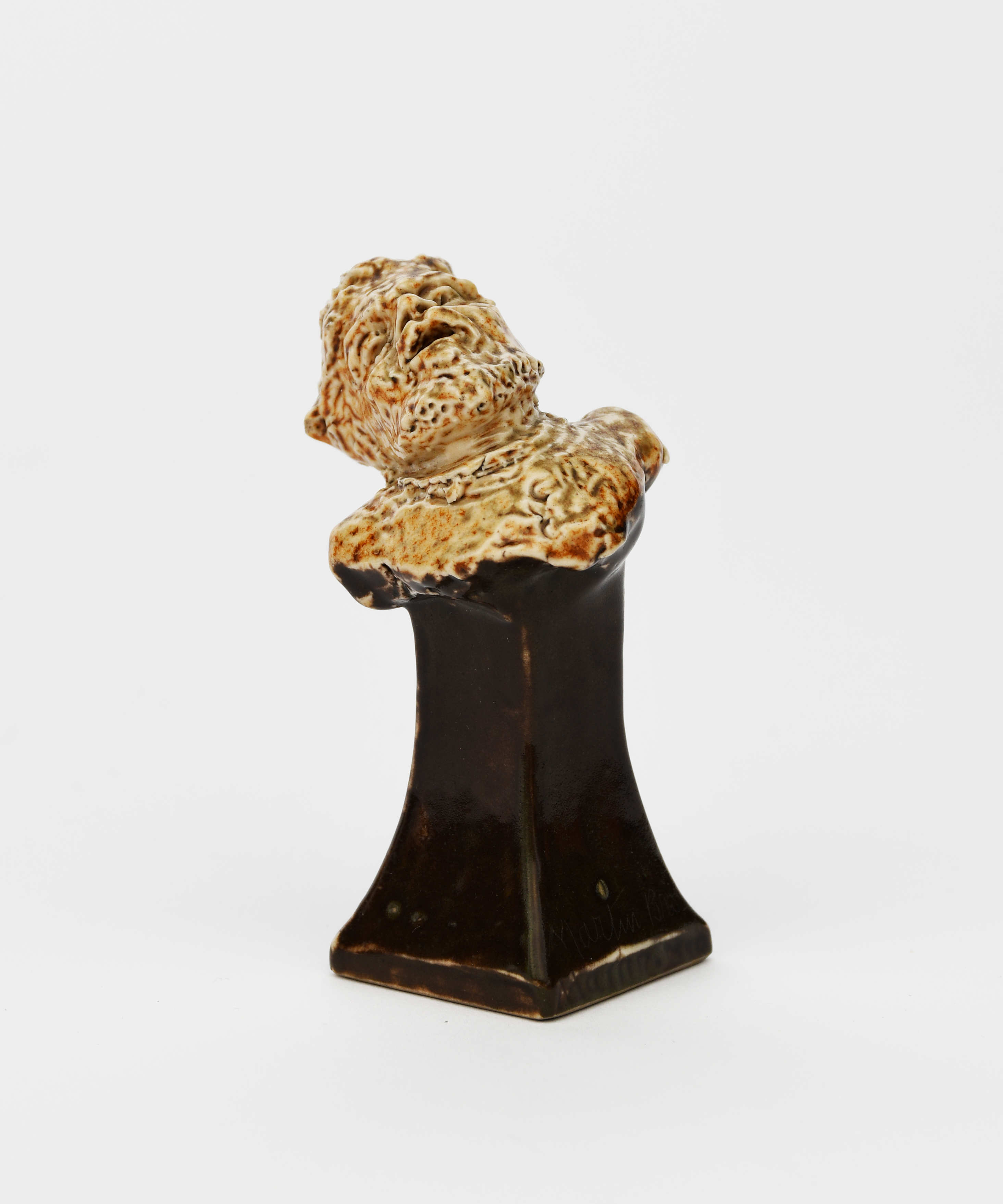A Martin Brothers stoneware pawn chess piece by Robert Wallace Martin, modelled as a man, head thrown backwards, on a flaring square section base, glazed tan and brown, incised Martin Bros London & Southall to base rim, 7.5cm. high