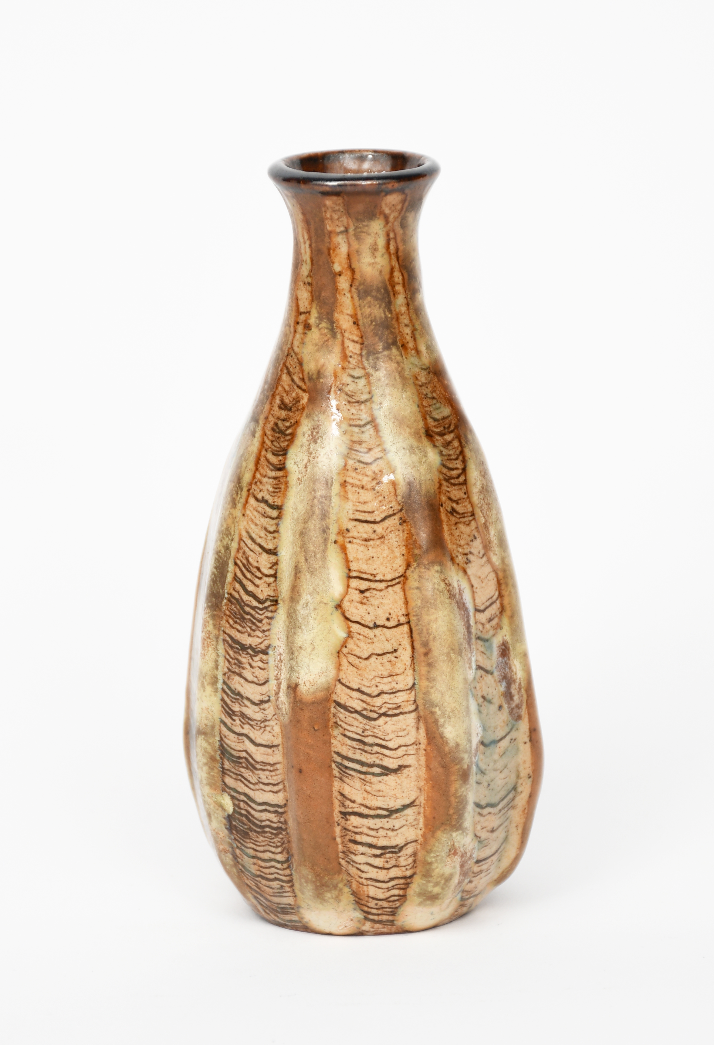 A Martin Brothers stoneware miniature gourd vase by Edwin & Walter Martin, dated 1899, tall, slender ribbed form with incised texture, glazed rust and tan, highlighted with blue, incised 1-99 Martin Bros London & Southall, 12cm. high