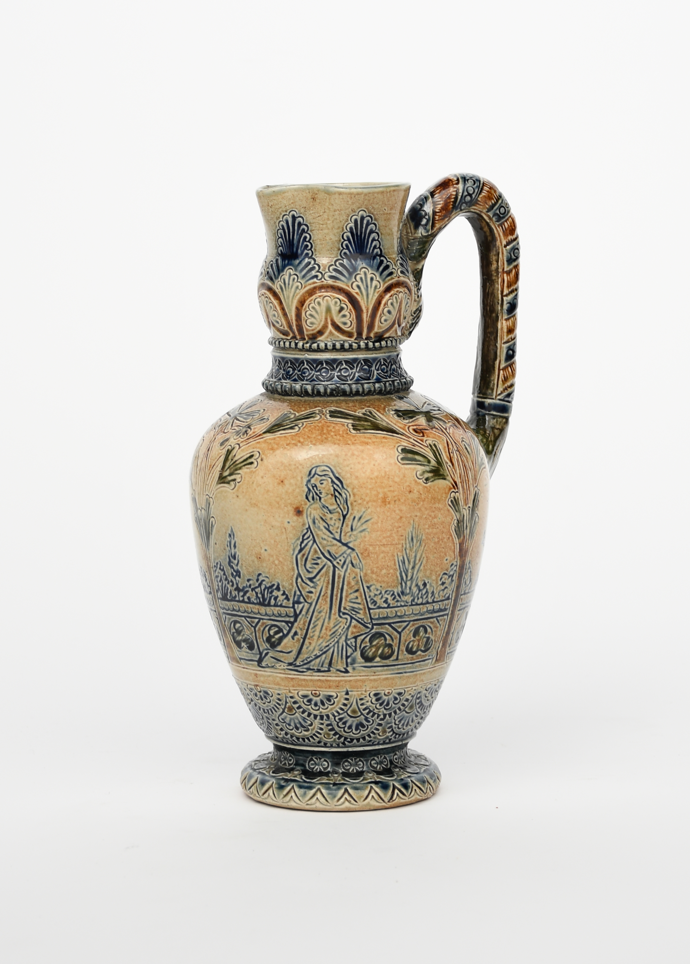A Martin Brothers Pottery stoneware Medieval jug, dated 1875, shouldered form with knopped neck and applied handle, incised with a lady playing a lute on a terrace setting with peacocks, the reverse with a maiden standing, glazed in blue and green on a buff ground, E.23 R W Martin London 1-1875, to base and plaque below handle, hairline to top rim, 24.5cm. high
