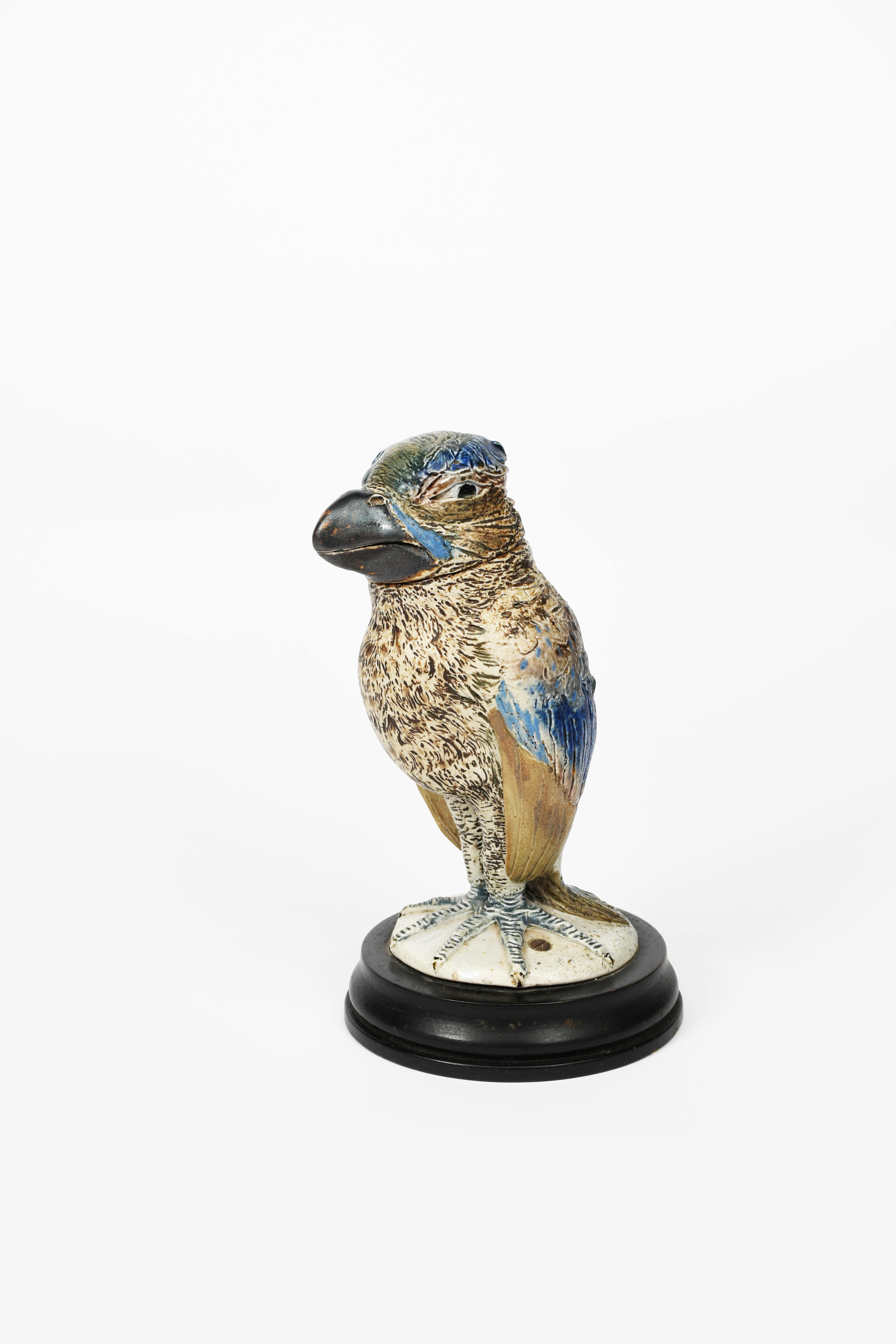 A Martin Brothers Pottery stoneware bird jar and cover by Robert Wallace Martin, dated 1892, the rotund bird with claw feet, short beak blue feather eyebrows and wings, in shades of blue, tan and green, highlighted with white, on ebonised wood base, painted Martin Bros 6-1892 London & Southall to neck, and indistinctly to the rim of the base, 19cm. high