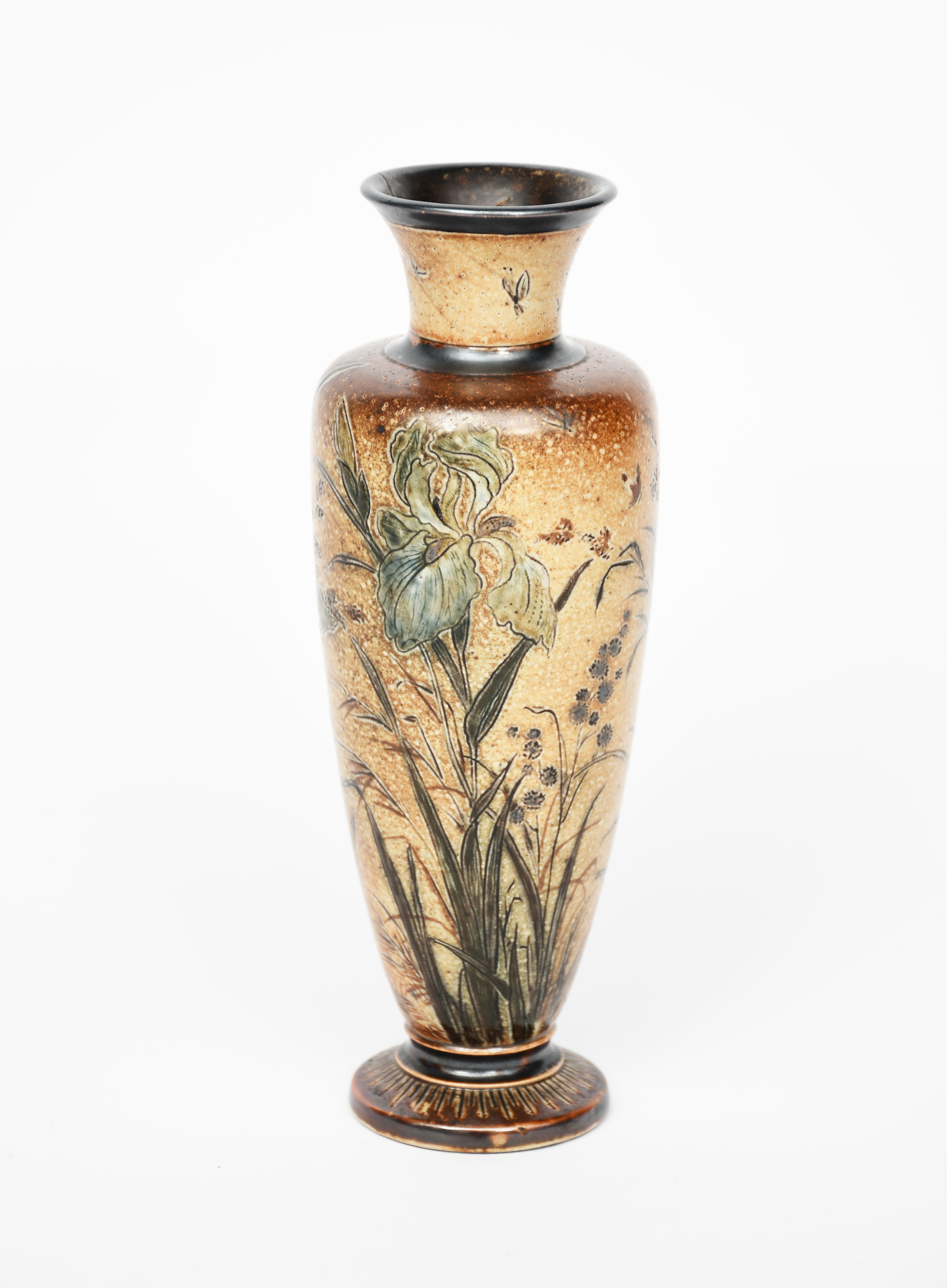 A Martin Brothers Pottery stoneware vase by Edwin and Walter Martin, slender, shouldered form, incised and painted with flag iris and wild flowers, the neck with mayflies blue, white and green on a mottled brown ground, 4-1899 Martin Brothers London & Southall, 22.5cm high