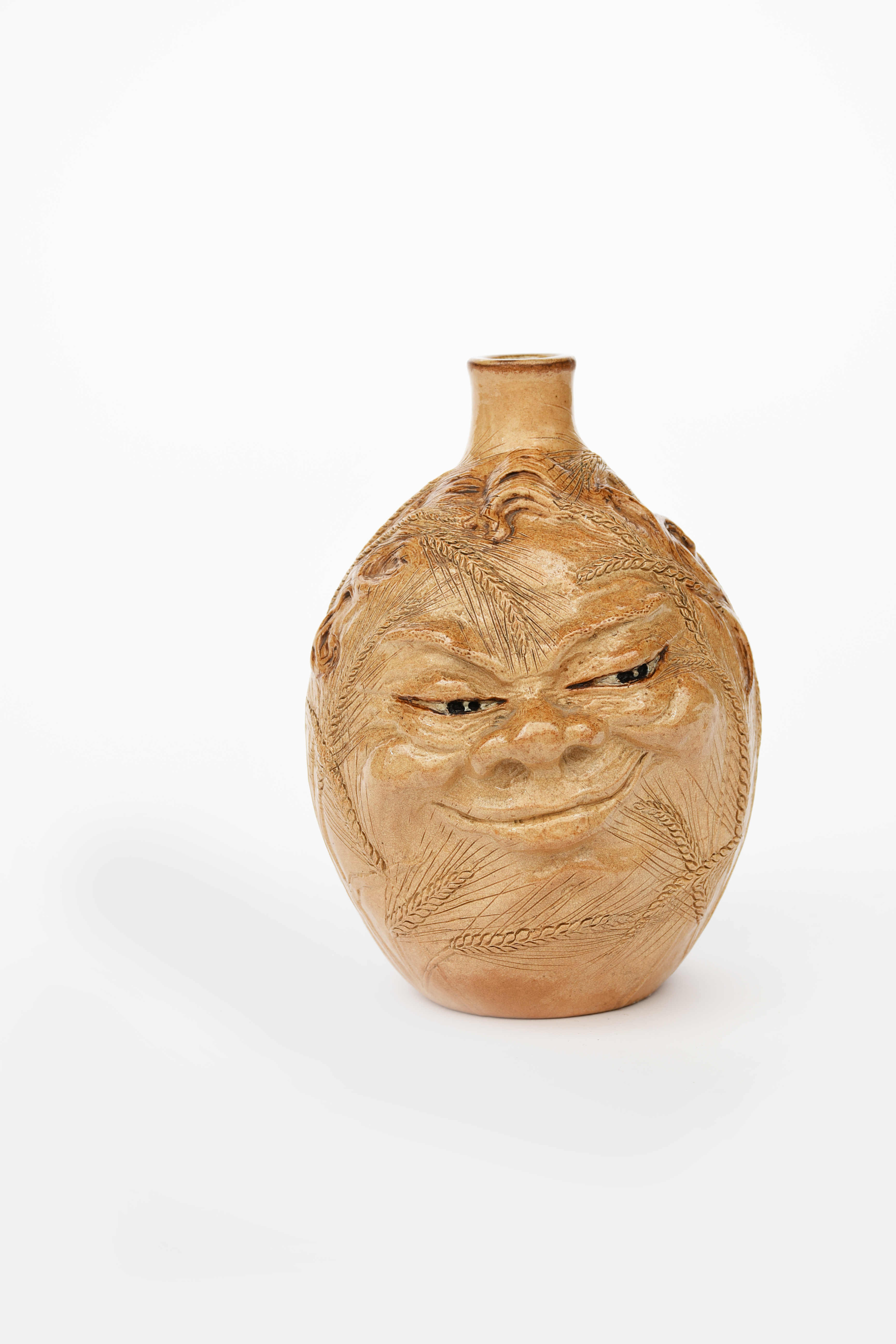 John Barleycorn a Martin Brothers Pottery stoneware bottle by Robert Wallace Martin, dated 1900, modelled in relief with a smiling face amidst ears of corn, glazed buff with white and back highlights, incised 5-1900 regd mark Martin Bros London & Southall, stress hairlines to handle, 18.5cm. high