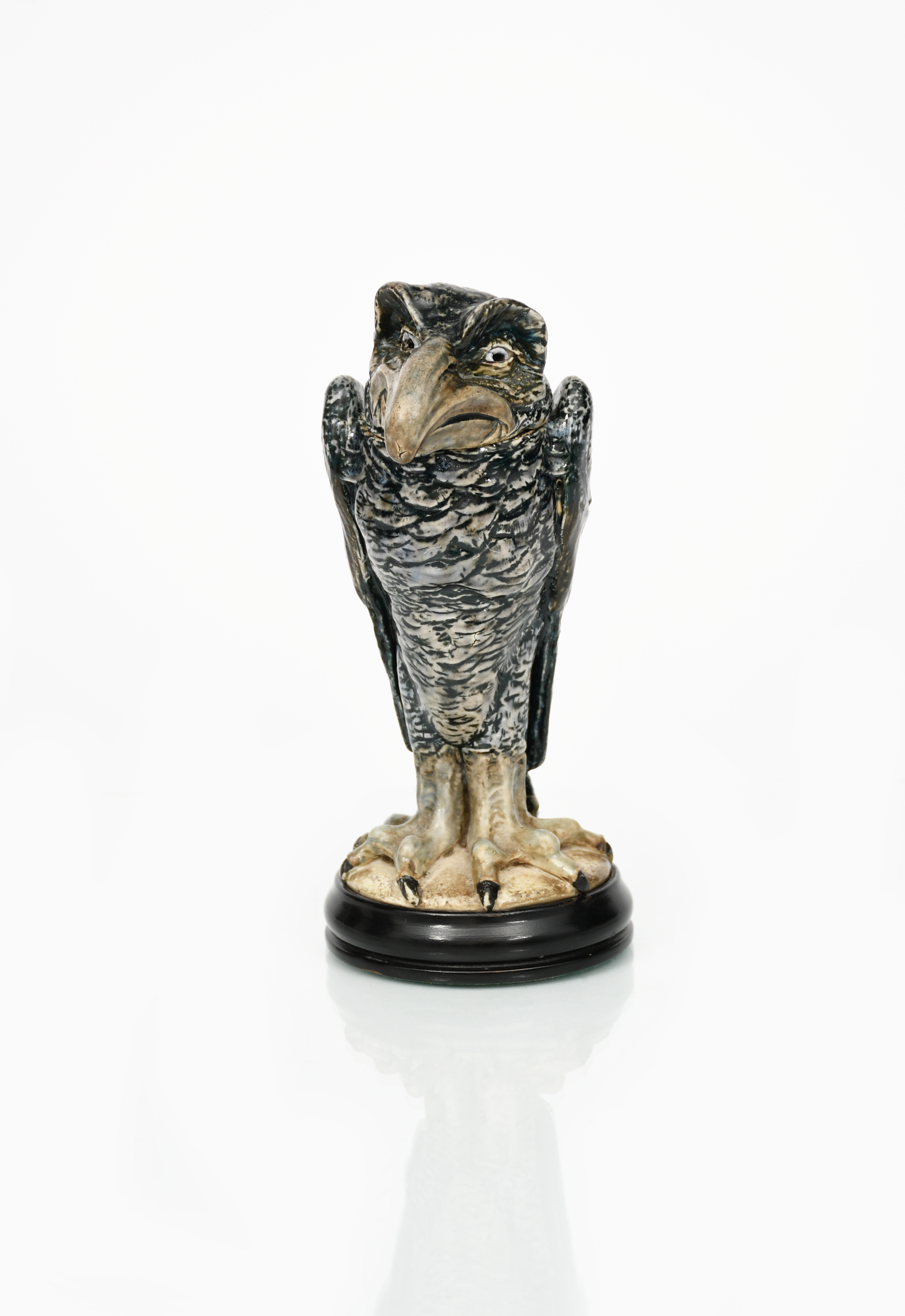 A Martin Brothers stoneware bird jar and cover by Robert Wallace Martin, dated 1905, slender body with hunched wings, with large webbed feet, forward looking resigned staring eyes and slender beak, glazed green, pale blue and white on a buff ground, on ebonised wood base, painted to neck and base Martin Bros, 1-1905 London & Southall, paper label to neck, 21.5cm. high