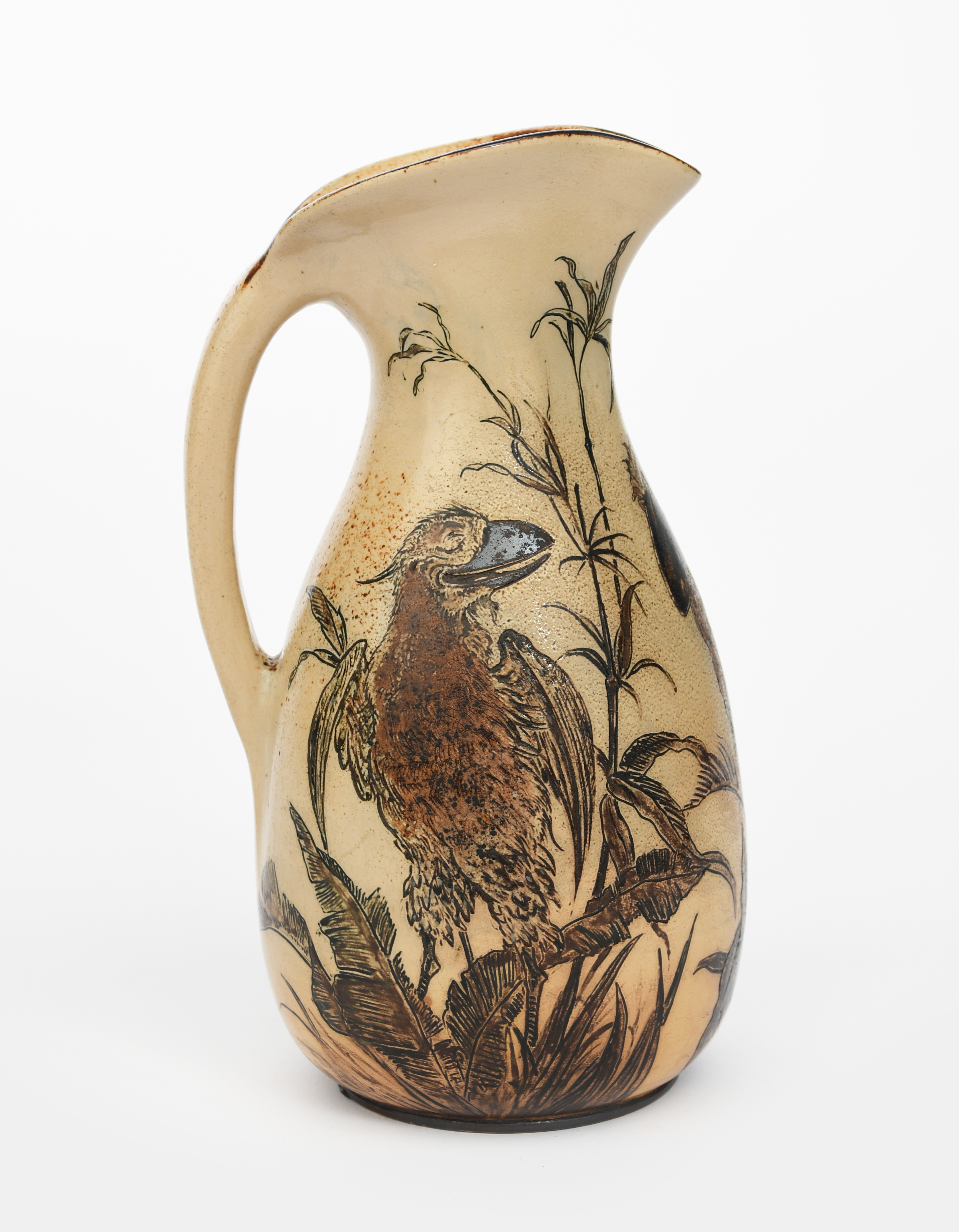 A Martin Brothers Pottery stoneware Bird jug by Edwin and Walter Martin, dated 1894, slender form incised with three anthropomorphic birds, amongst palm fronds, in shades of green and brown on a buff ground, incised 8-1894, Martin Bros London & Southall, 984, 24.5cm. high