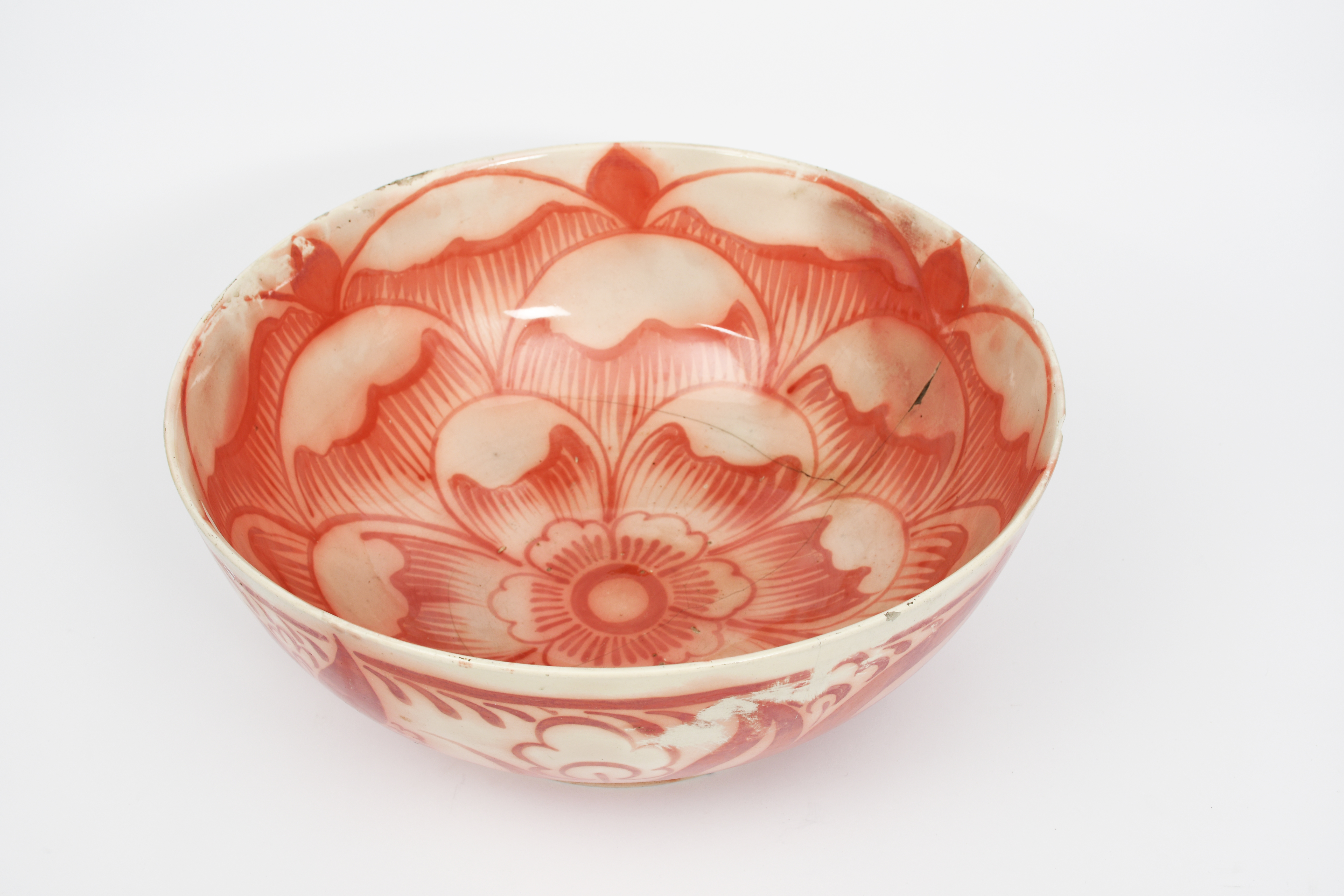 A large pottery footed bowl probably William De Morgan, on ivory blank, painted to the exterior with foliage frieze, the interior a large flowerhead, in ruby on a white ground, impressed ivory mark, repaired damages, 41cm. diam, 18cm. high