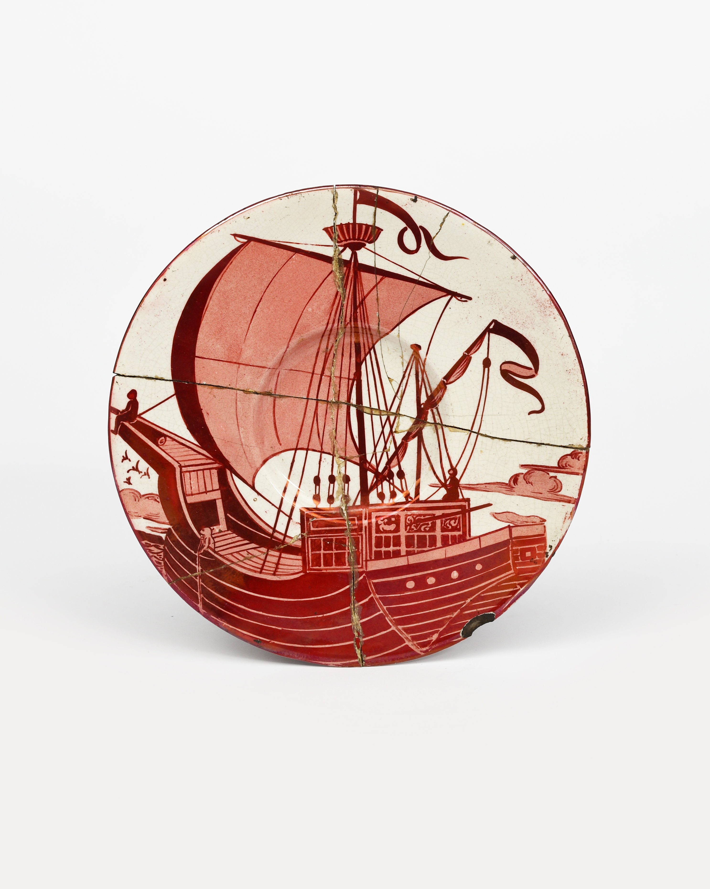 A William De Morgan Galleon plate, painted with a galleon weighing anchor, in ruby lustre on a white ground, the reverse with foliate design, unsigned, smashed and repaired, 21.5cm. diam.