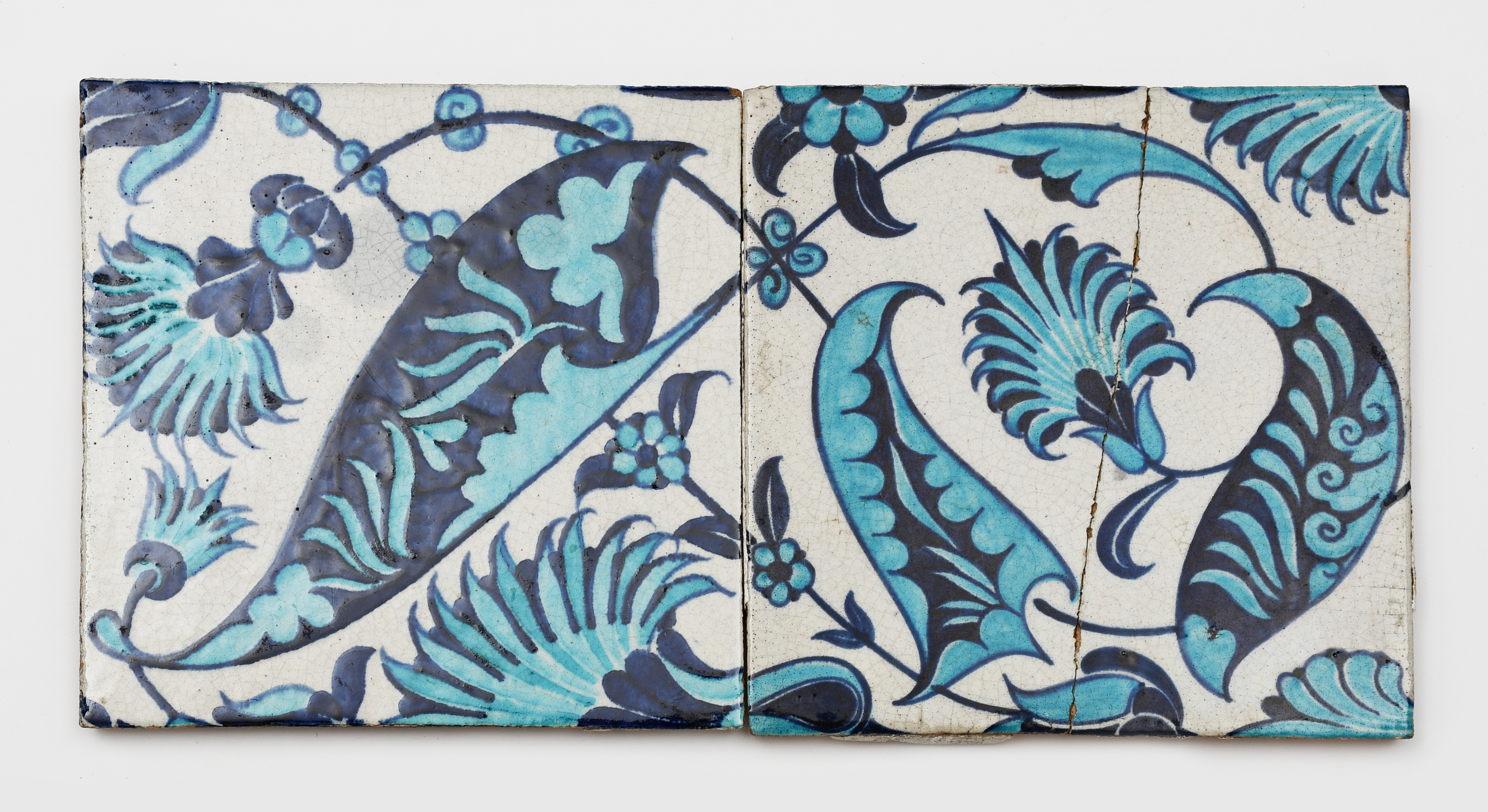 Two William De Morgan Persian tiles, painted with stylised foliage fronds in dark and pale blue on a white ground, six large tiles moulded in low relief with birds, covered in a mustard yellow glaze, and a collection of tiles including Delft tin-glaze tiles, impressed Sand's End and Late Fulham marks, one in half and re-stuck damages to collection of tiles, 15.5cm.square, (a lot)