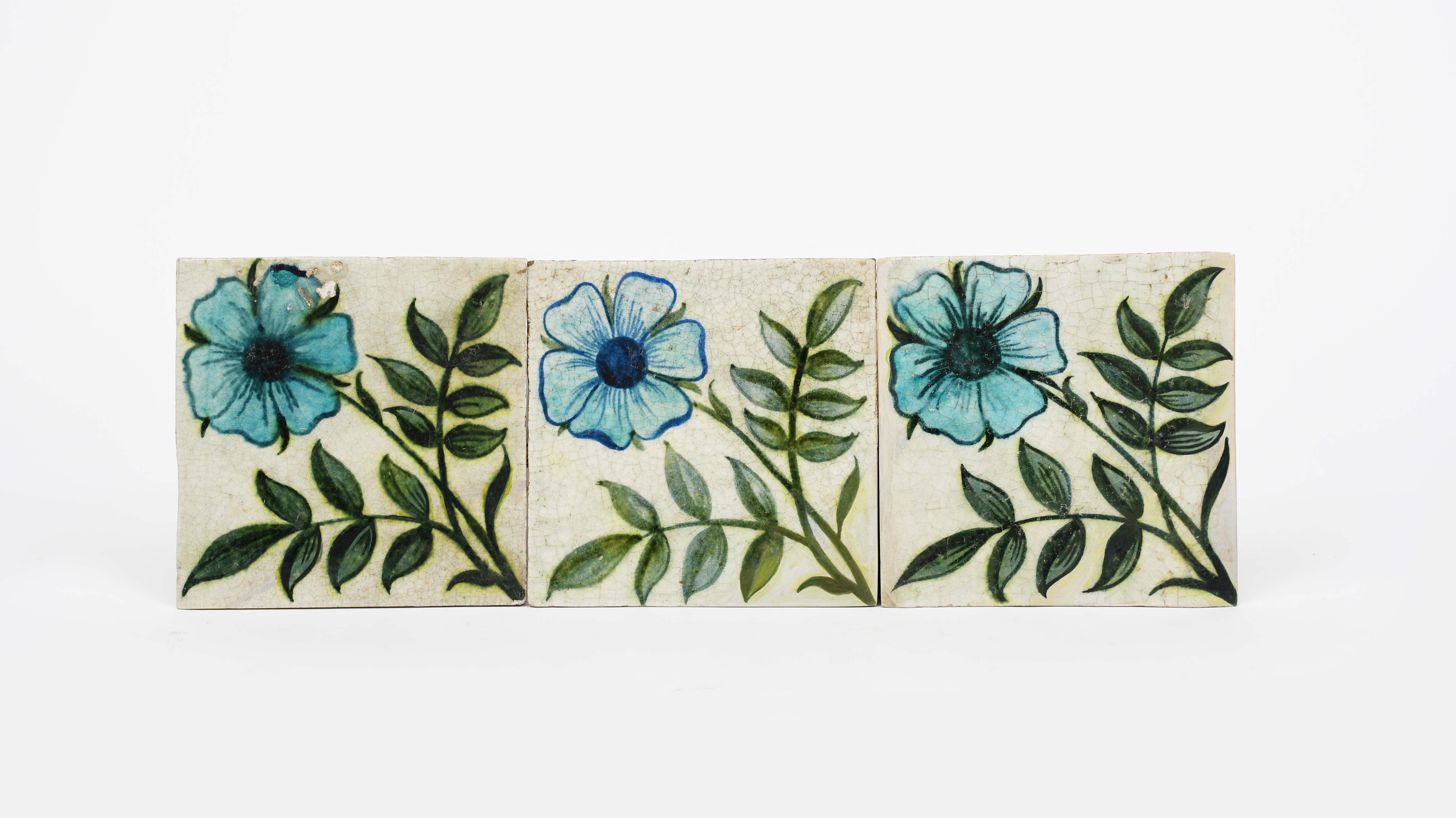 Three William De Morgan Chelsea Period Single Rose tiles, each painted with a single flower in shades of blue and green on a white ground, impressed marks to one, restoration, 15.8cm. square (3)