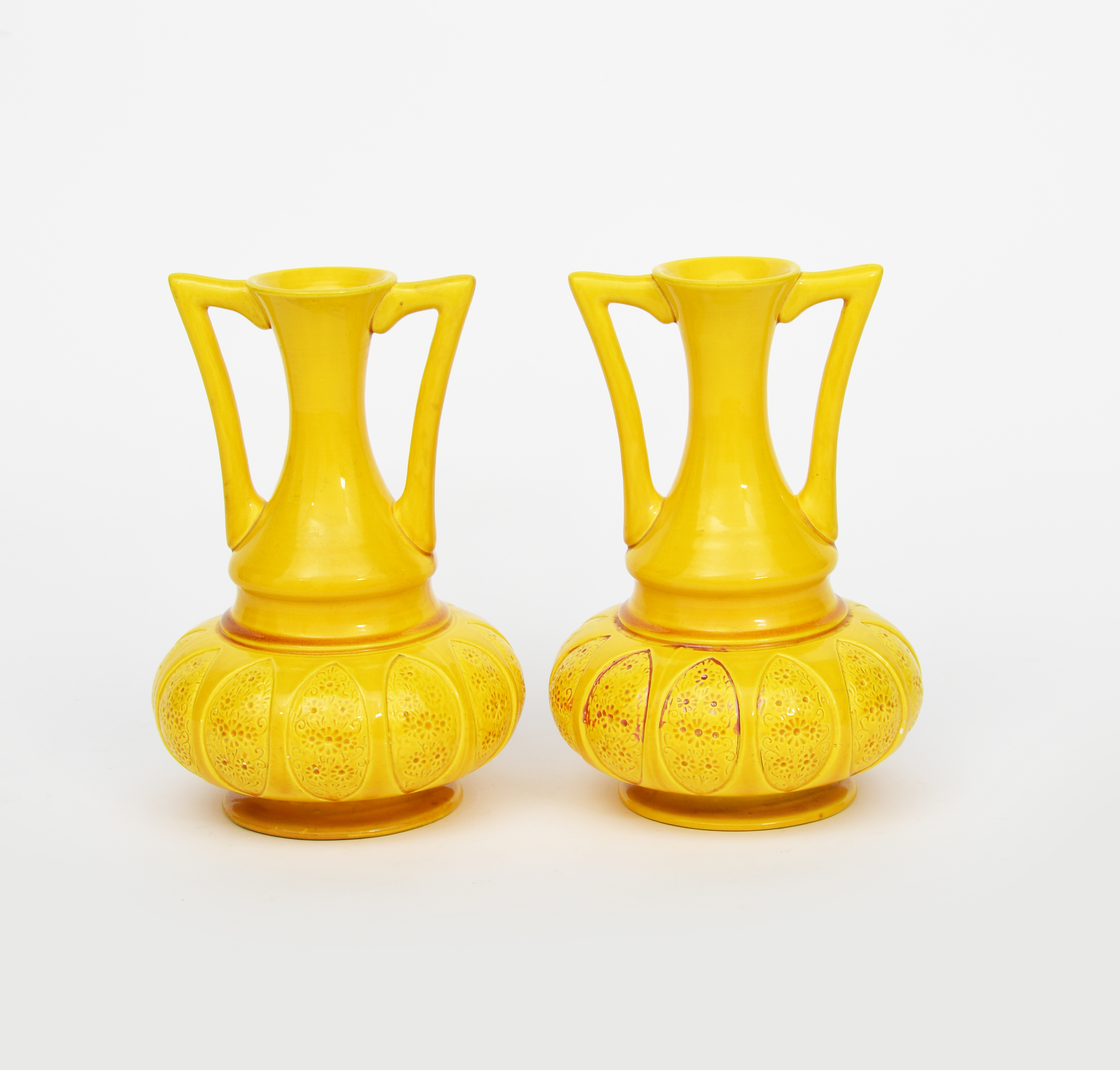 A pair of pottery twin-handled vases designed by Dr Christopher Dresser probably Ault, compressed ovoid form with waisted necks and angular twin-handles, modelled in low relief with elliptical panels of flowers, covered in a vivid yellow glaze, impressed facsimile signature, professional restoration to foot rim, 22cm. high, (2)
