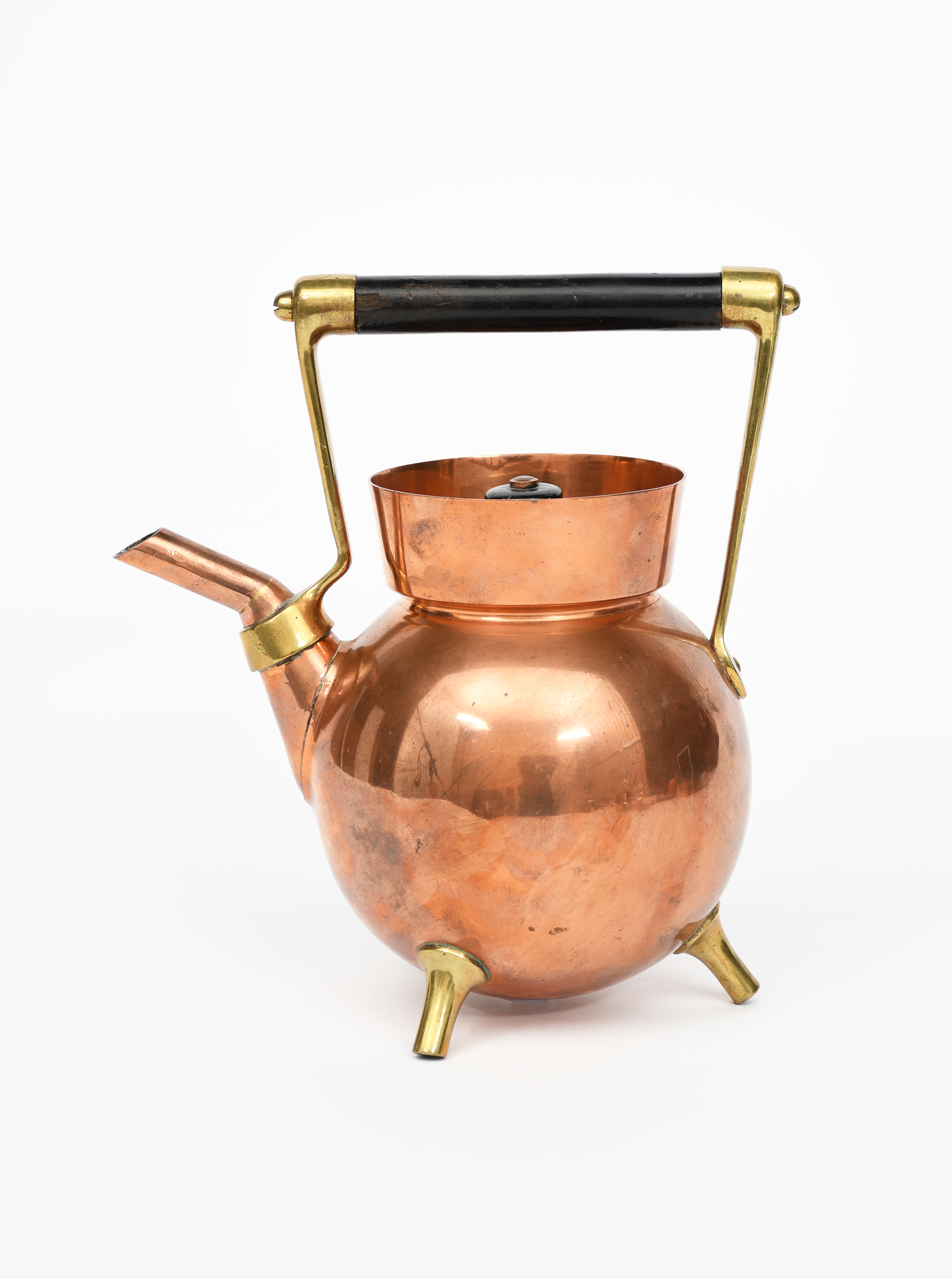 A Benham and Froud copper and brass kettle designed by Dr Christopher Dresser, ovoid with spike feet, collar rim with angular spout and applied brass handle with ebonised rod, the cover with ebonised wood finial, stamped Benham & Froud mark, 24.5cm. high (2)
