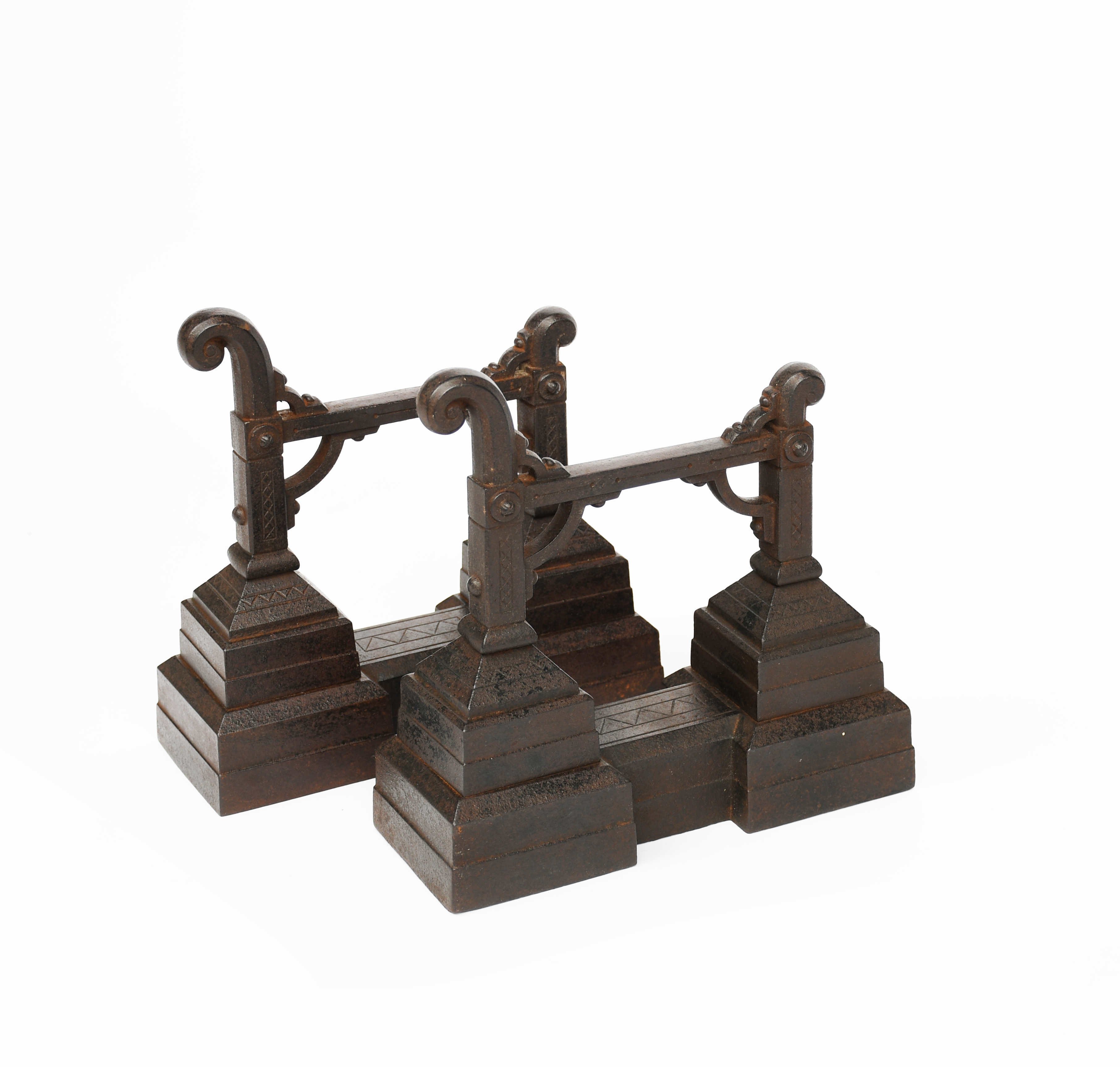 A pair of cast iron fire dogs probably Kenrick designed by Dr Christopher Dresser