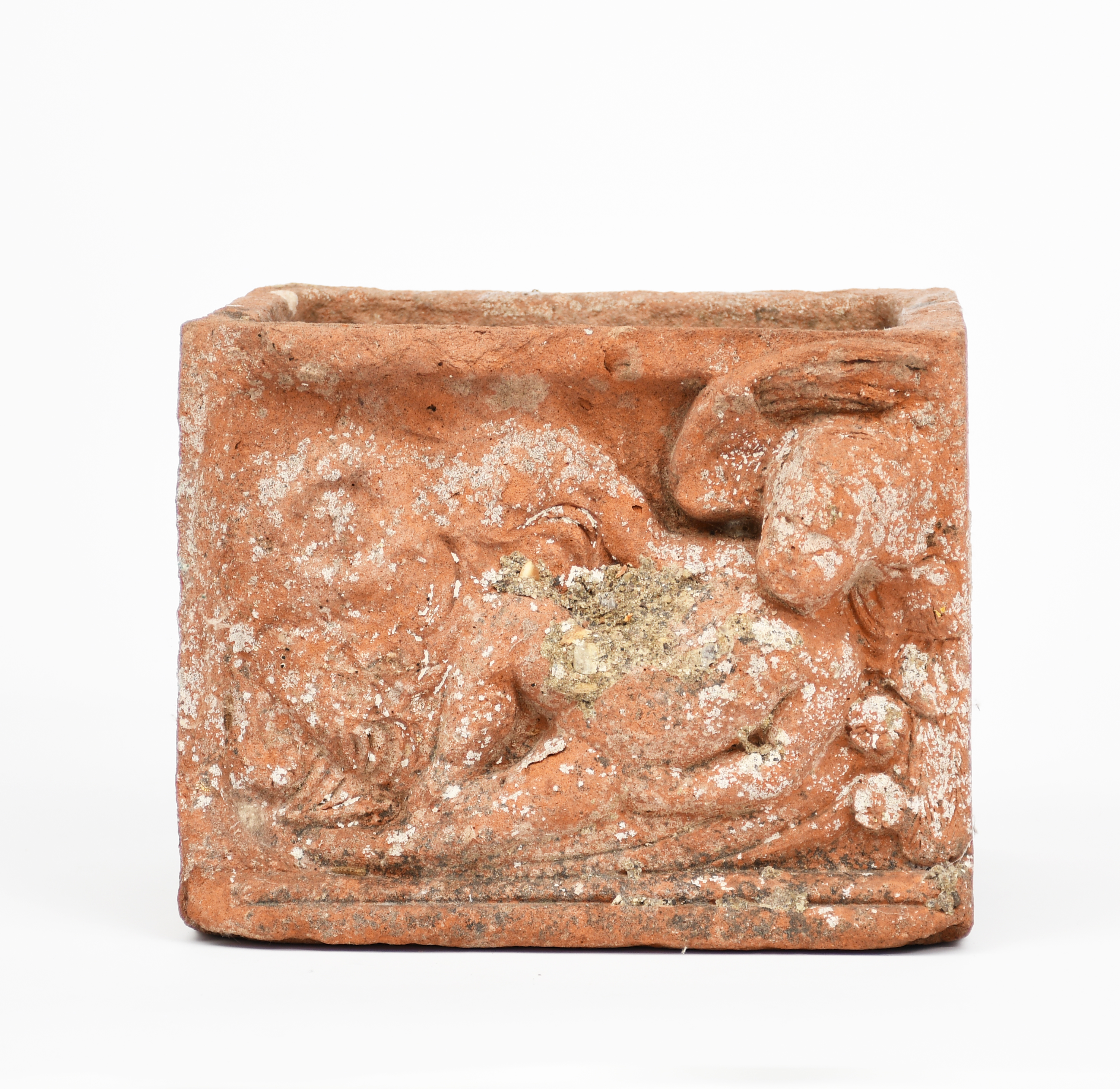 A Compton Pottery The Potters' Art Guild terracotta planter designed by Mary Seton Watts, rectangular section, cast to the front with a reclining cherub, unsigned, 18cm. high, 22.5cm. wide