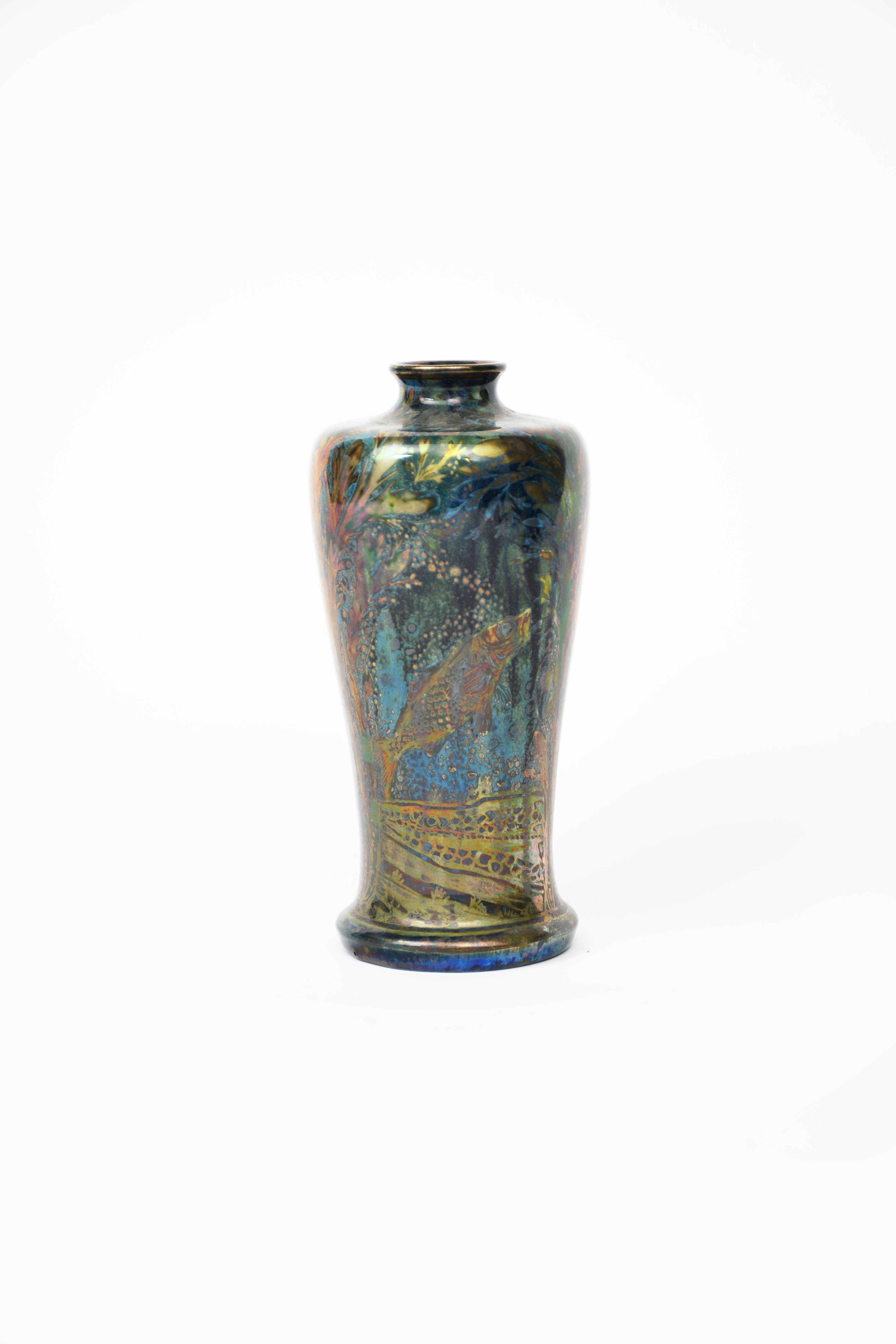 A Pilkington's Lancastrian lustre vase by Richard Joyce, dated 1919, slender, shouldered form painted with scaly fish swimming amongst waterweed, in golden lustre on a streaked blue and green lustre ground, impressed marks, painted artist cipher, 17.5cm. high