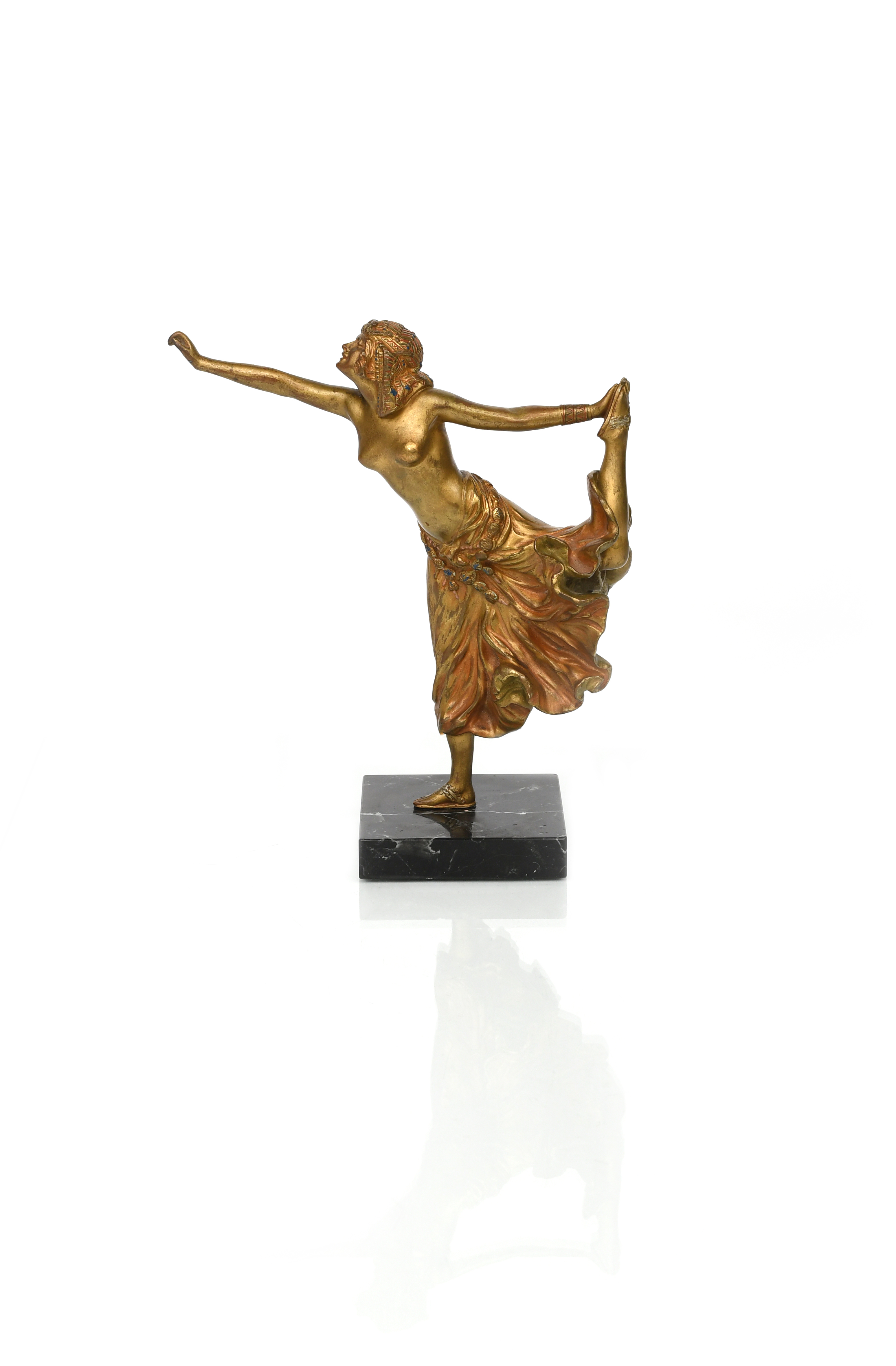 gilt patinated Art Nouveau bronze of a woman standing, balanced on one leg, in exotic headdress and flowing skirt, with cold painted jewels, on later veined black marble base