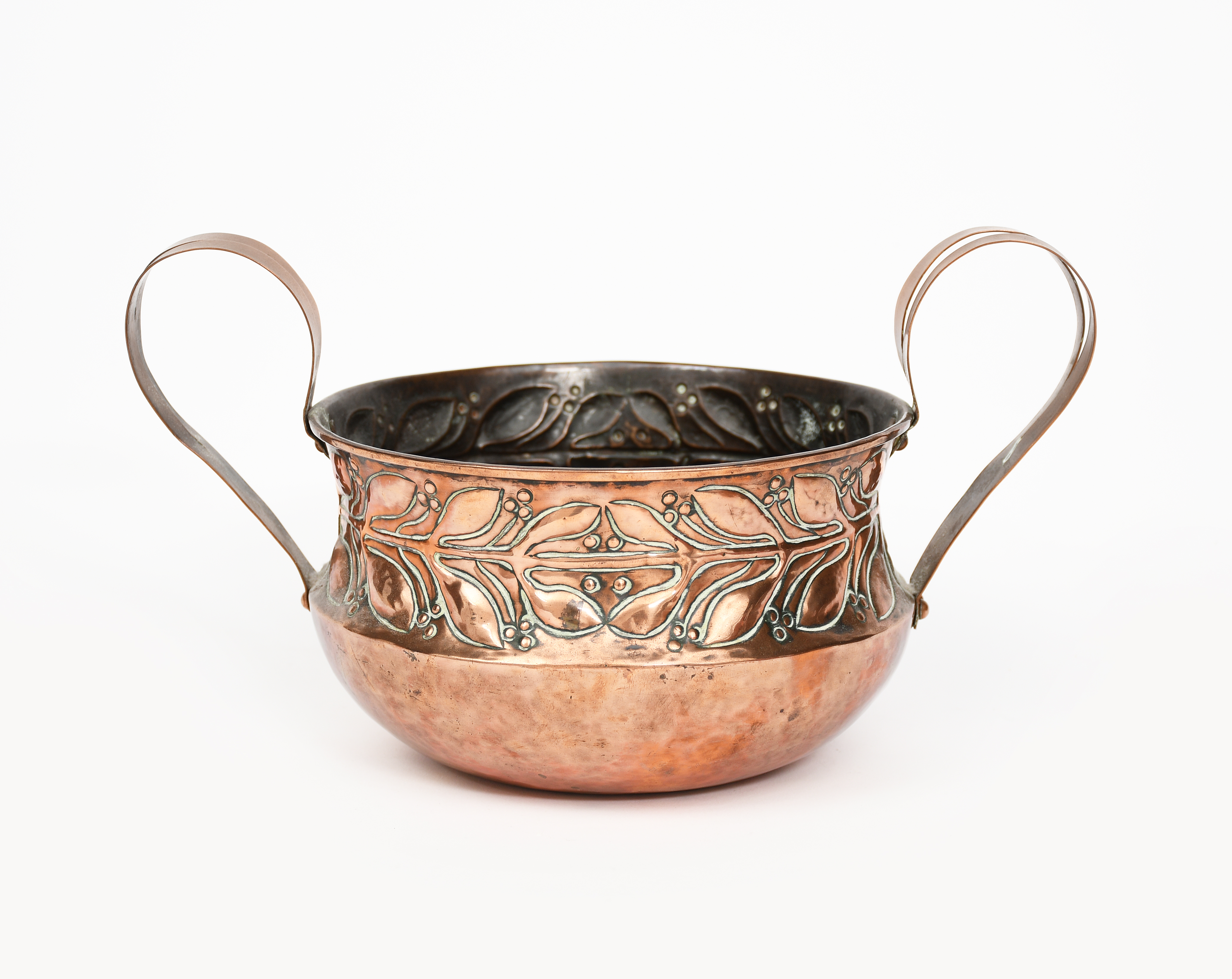 A Keswick School of Industrial Arts copper twin-handled Greek bowl, shouldered form, hammered in low relief with berried laurel border, applied loop handles, stamped KSIA mark, 25.5cm. wide, 14cm. high