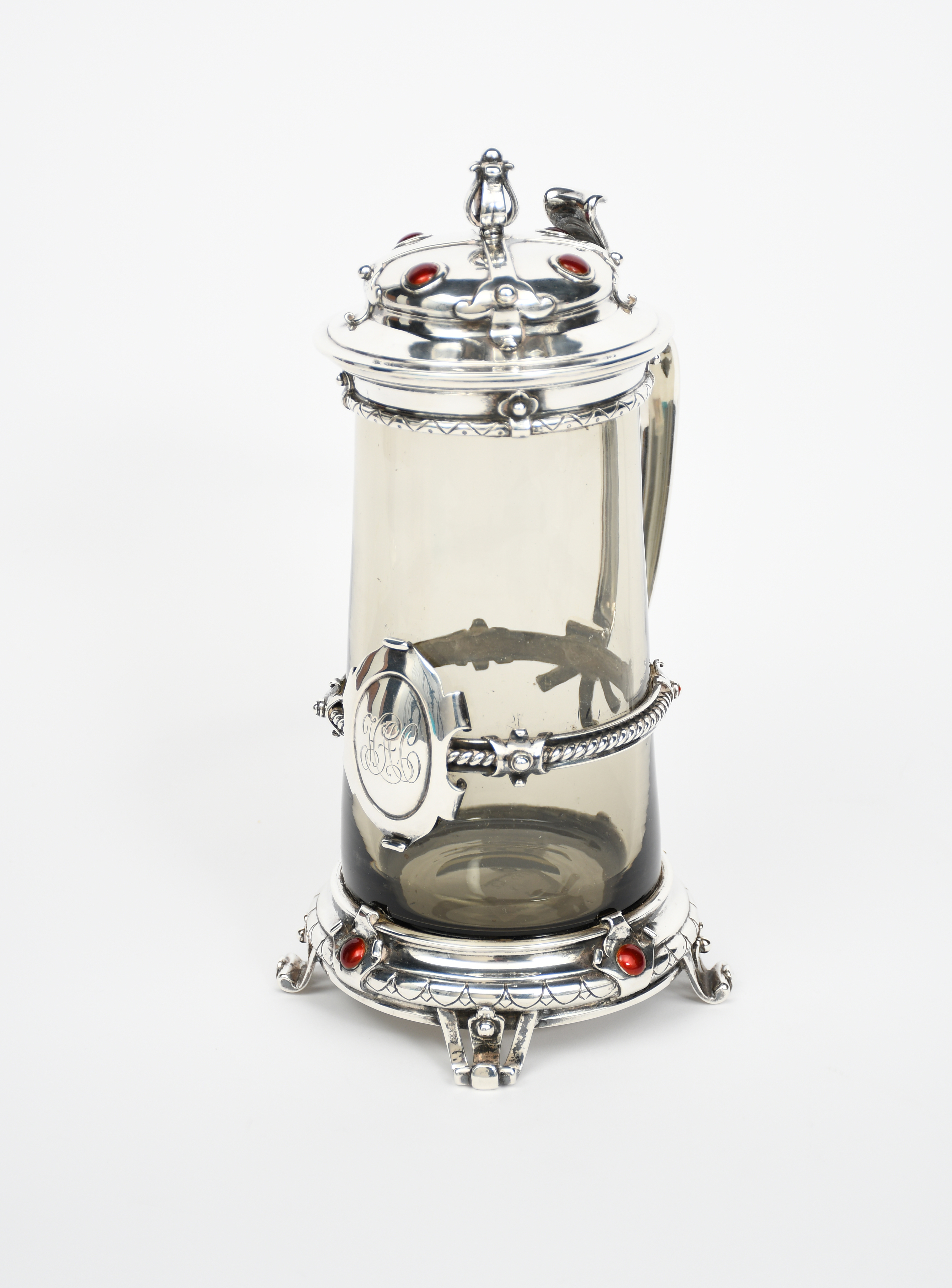 A silver mounted glass tankard and cover, swollen low base on four tapering, scrolled feet, cast in low relief with geometric band and shield panel with central red enamel roundel, tapering glass body with central ropetwist band with engraved shield panel, silver top rim with hinged domed cover with radiating straps and red enamel roundels, central floral finial, stamped hallmarks, London 1901, 23cm. high