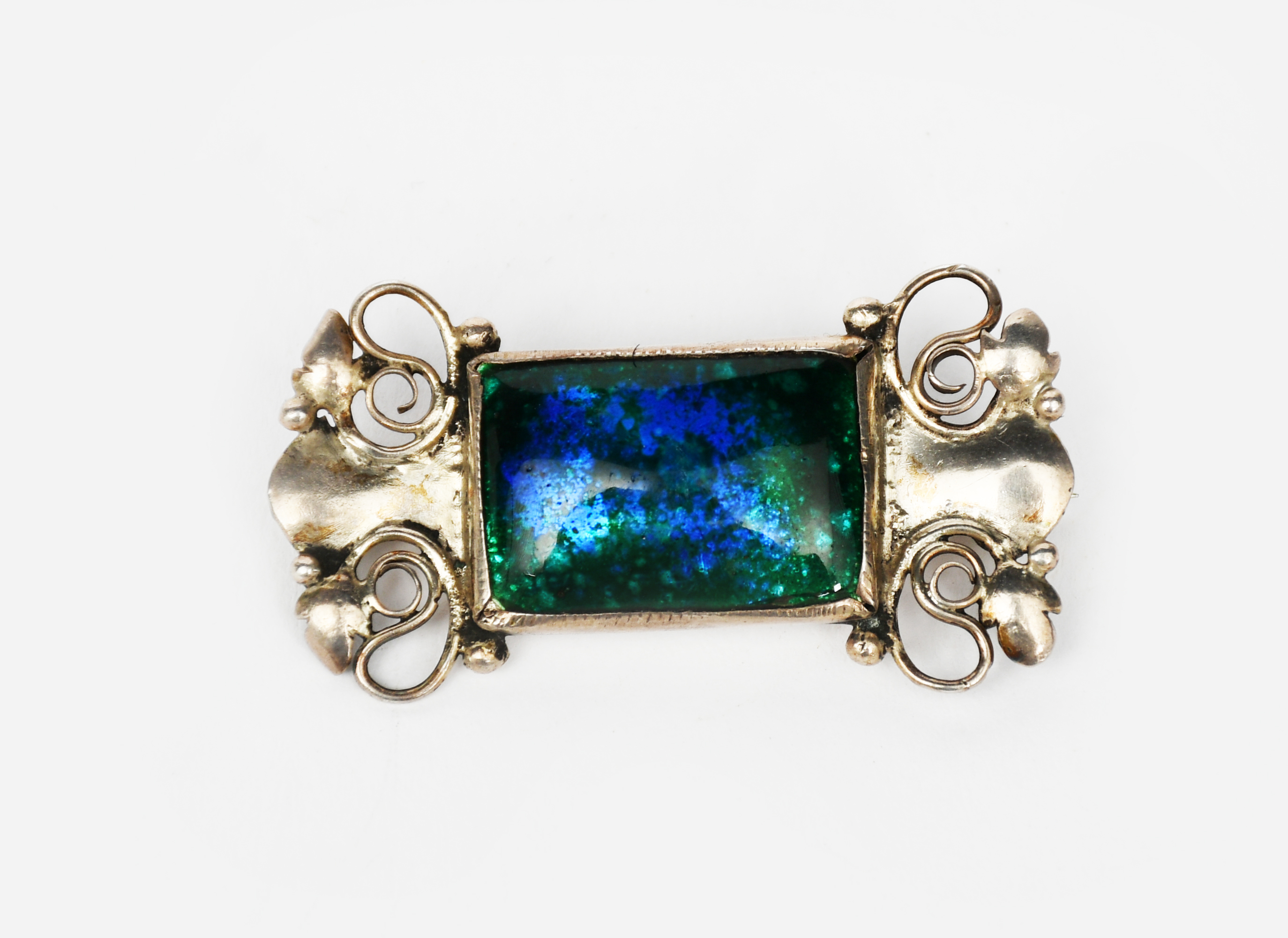 A silver and enamel brooch the design attributed to the Guild of Handicraft, rectangular form with scrolling foliate panels to each end, set with rectangular green and blue panel, unmarked, 3.5cm. wide.