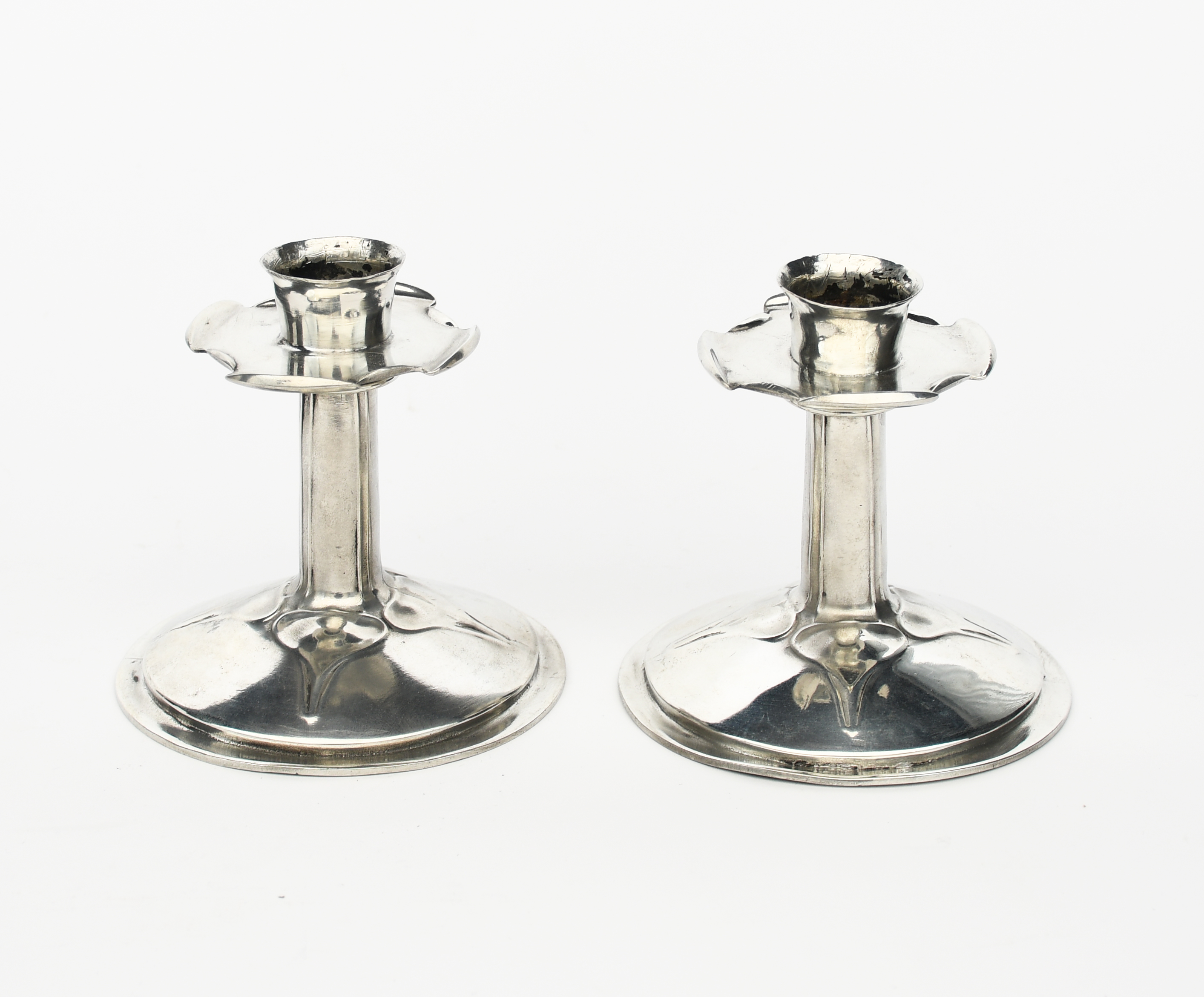 A pair of Liberty polished pewter candlesticks designed by Archibald Knox, model no.023, domed base cast in low relief with radiating foliate motif, cylindrical stem with flaring quattro-lobed sconce, stamped 023, 12cm. high, (2)