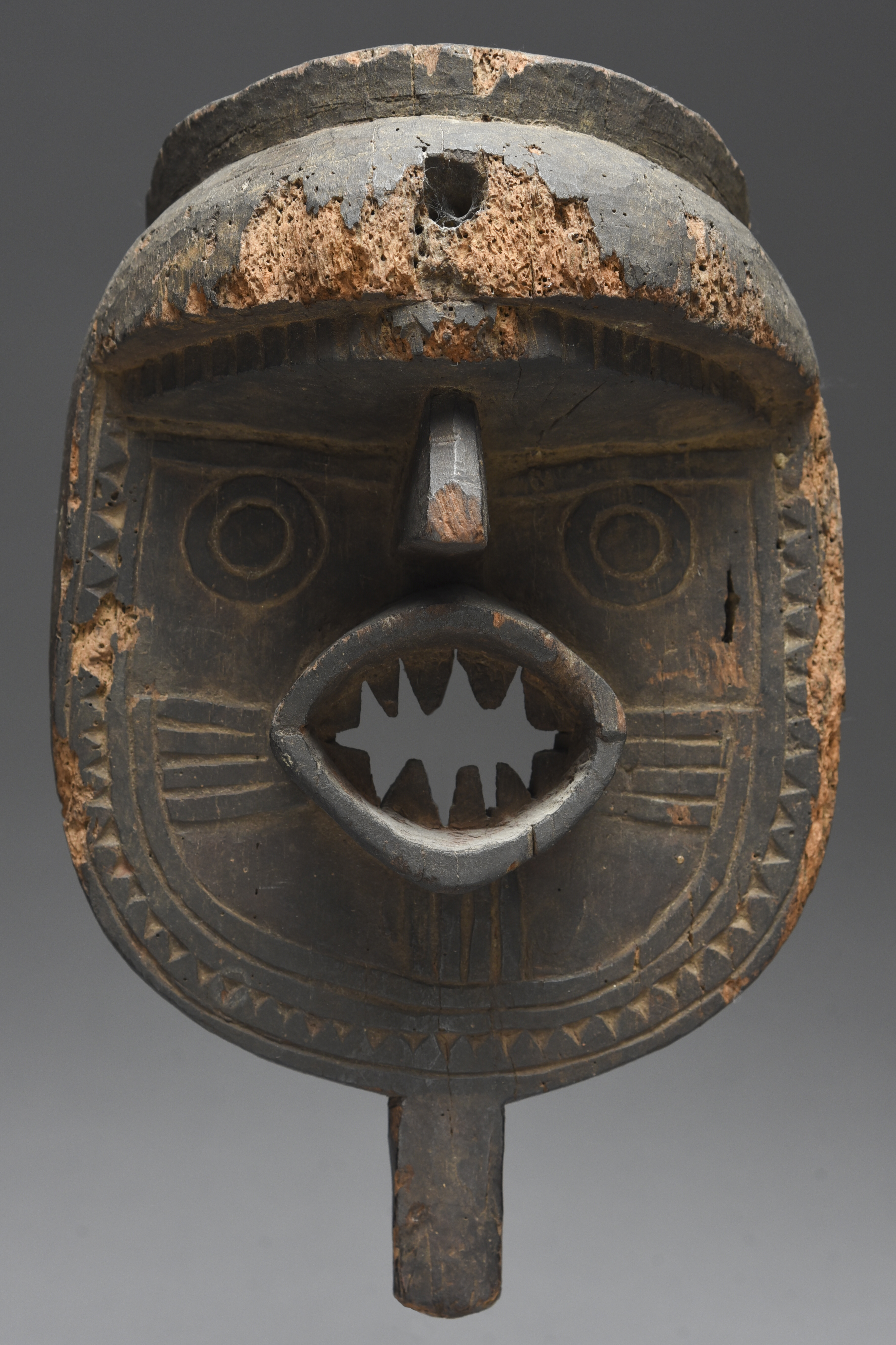 with a protruding forehead and nose, an open mouth with bared teeth and low relief carved eyes and scarifications, with a chin handle,