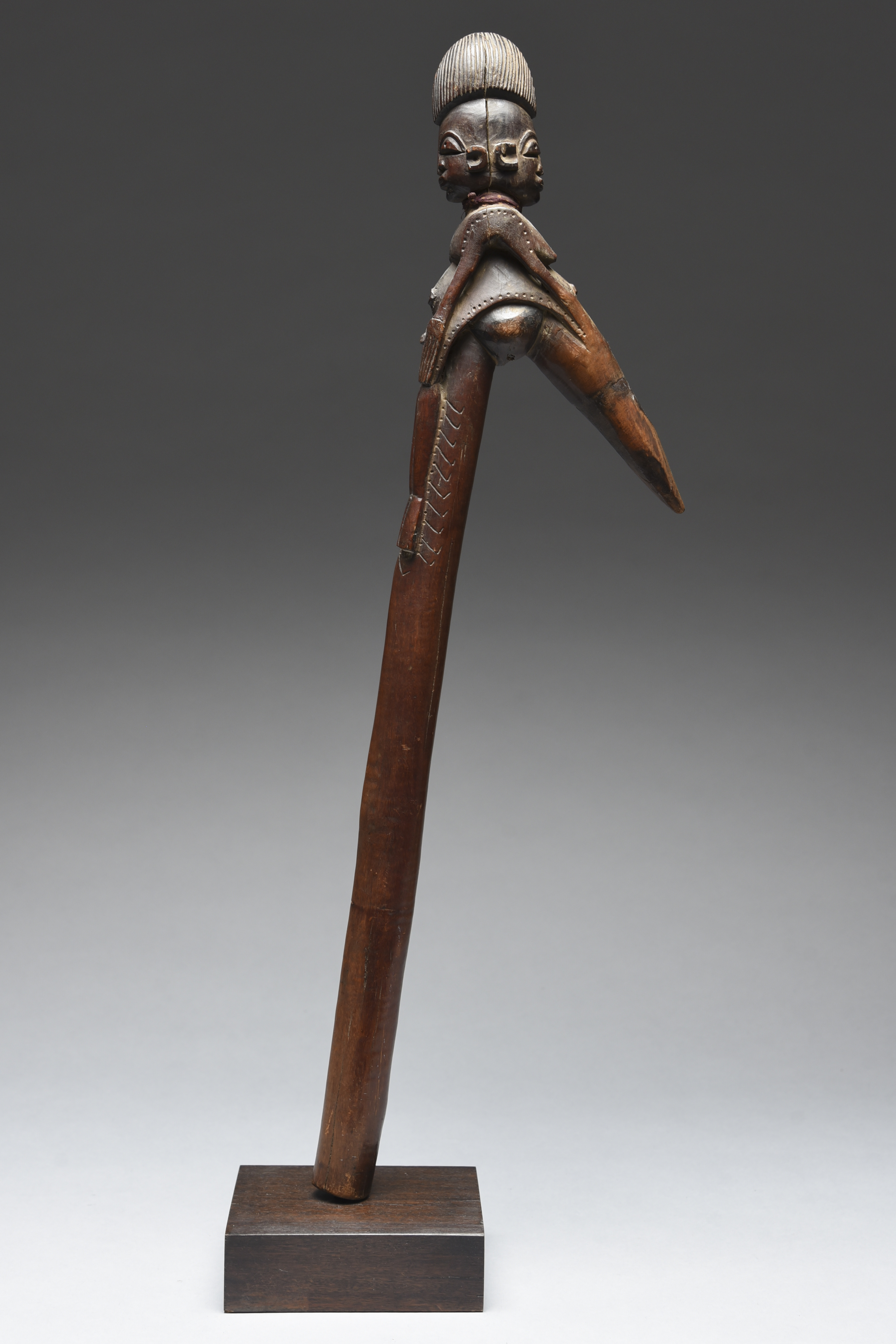 carved a male and female figure, with a fabric necklace and with dot, linear and burnished decoration,