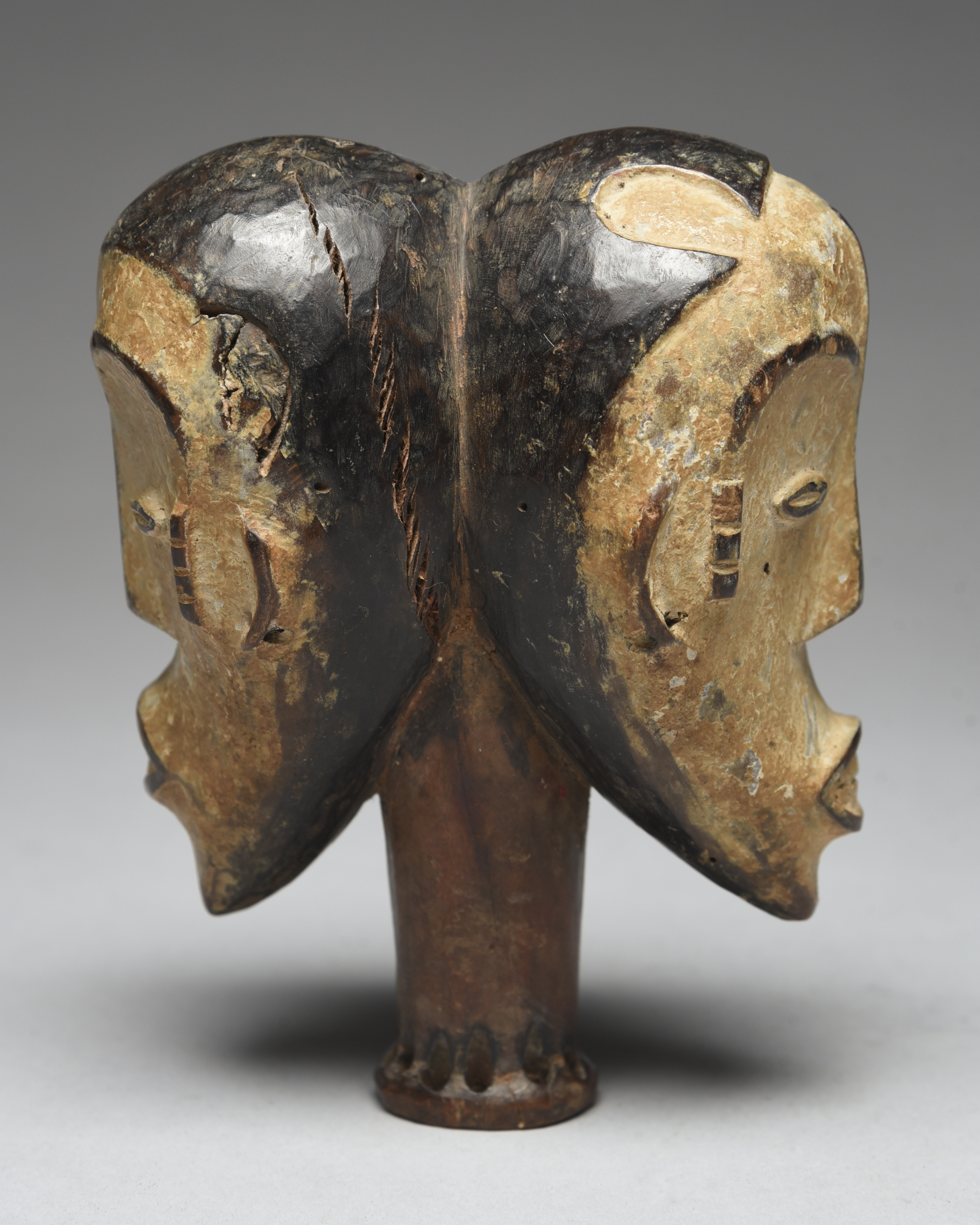 with differing coiffures and with temple keloids, bared teeth and pierced ears, on a tapering support with a pierced flange, with burnishing and white pigment,