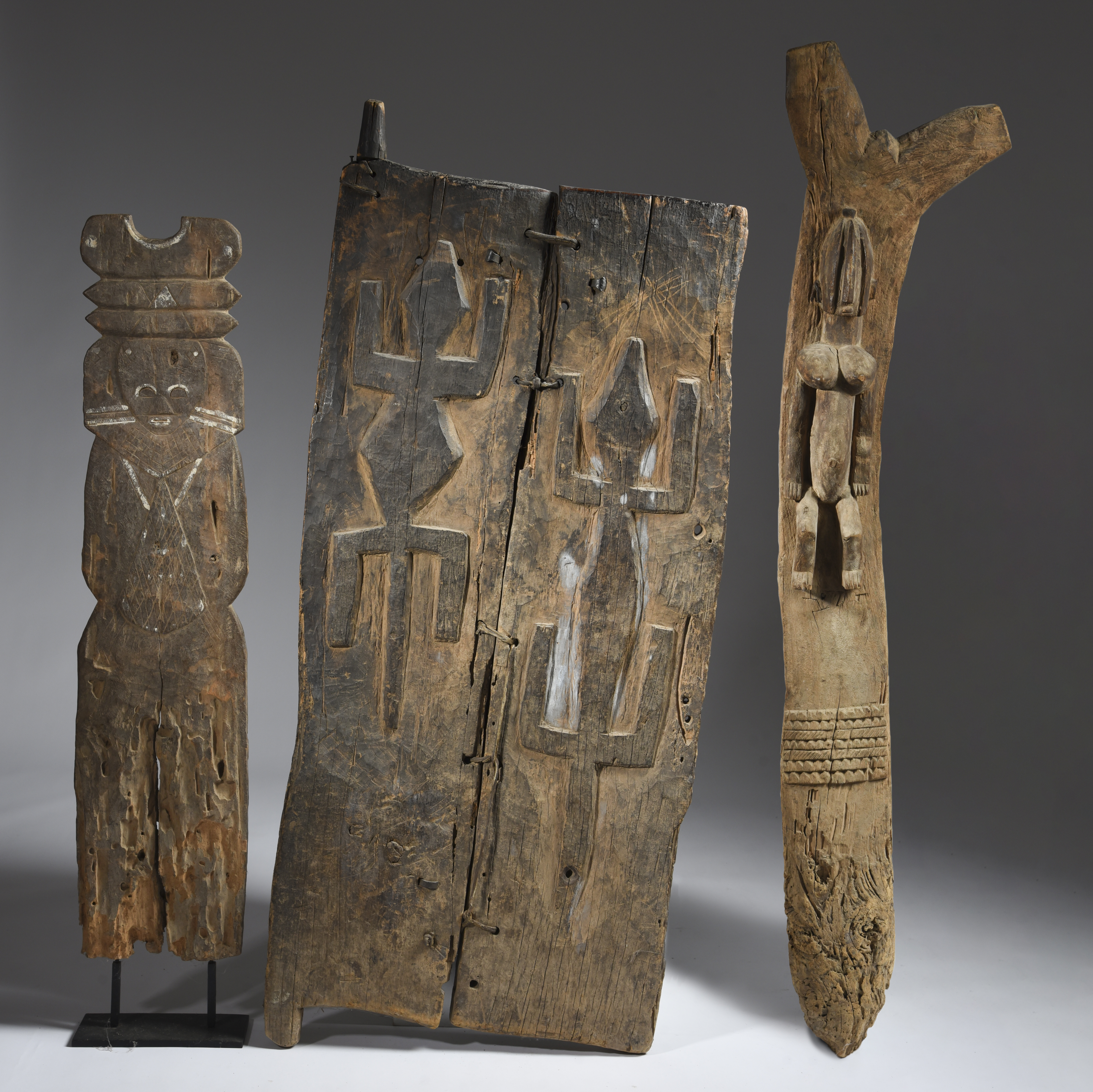 a Dogon post, 138cm high and an Ivory Coast marker post, 108cm high, on a stand. (4)